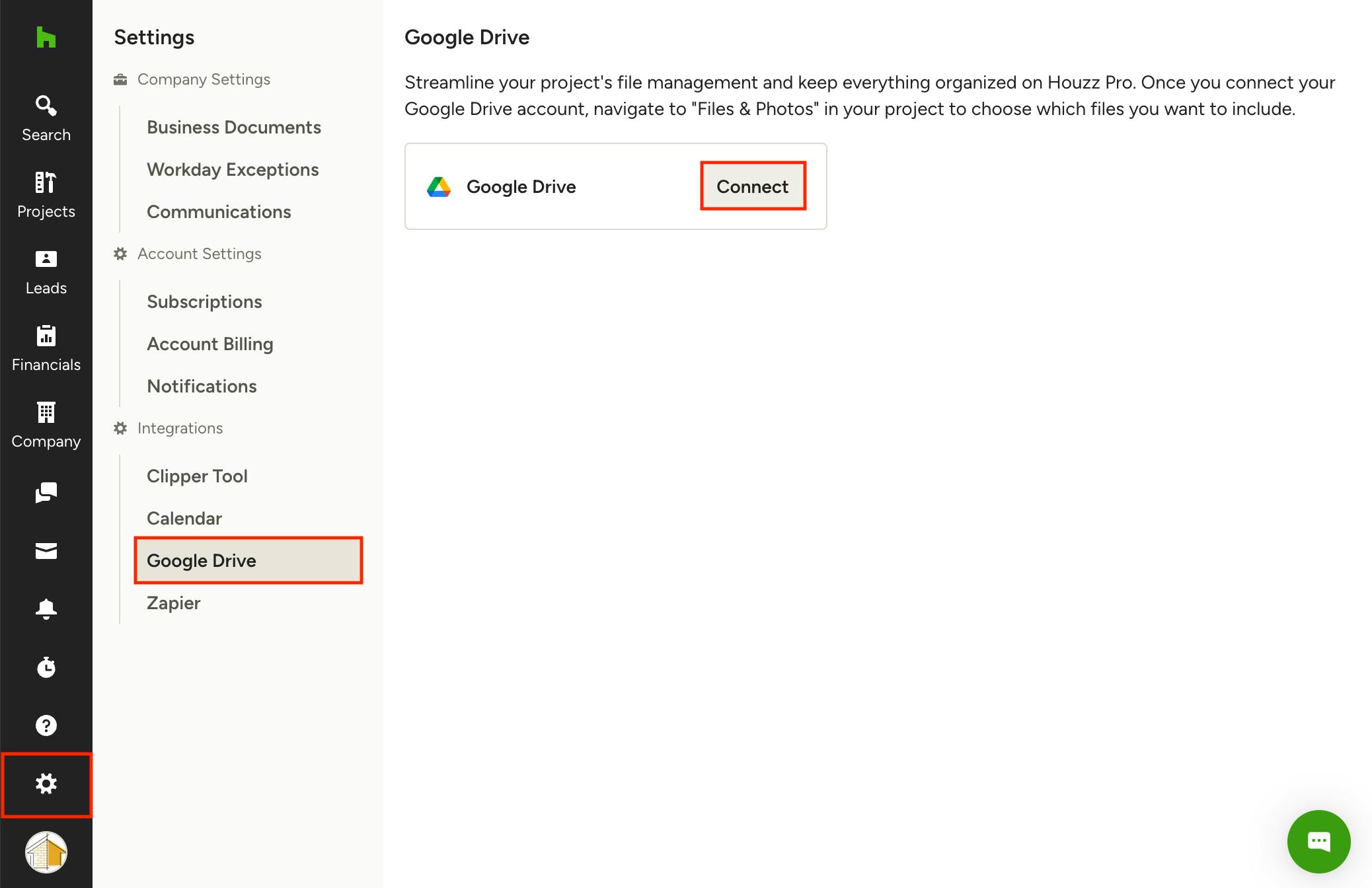 You can quickly connect Google Drive within the settings of your Houzz Pro account.