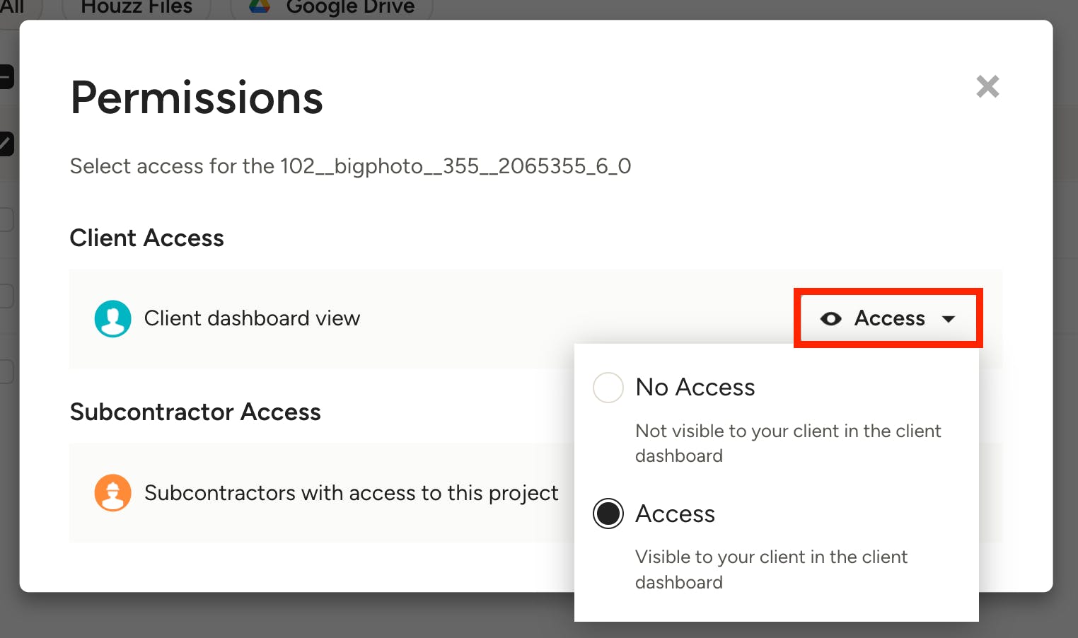 Be sure to select Access from the dropdown for Client Dashboard View — you can also adjust subcontractor access here as well.