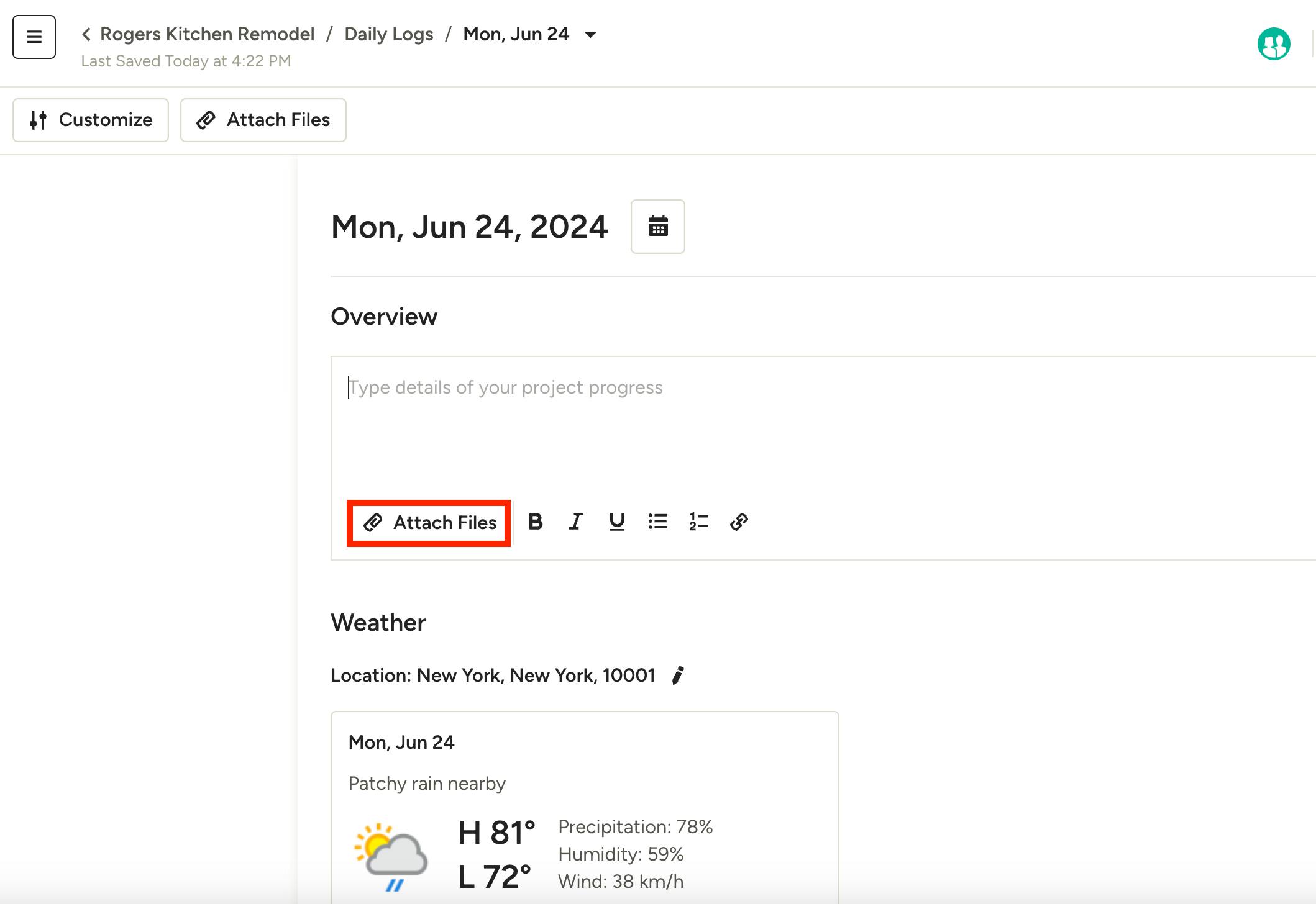 To do this, open up the relevant feature within your project, and select the Attach Files icon (as shown here within daily logs).