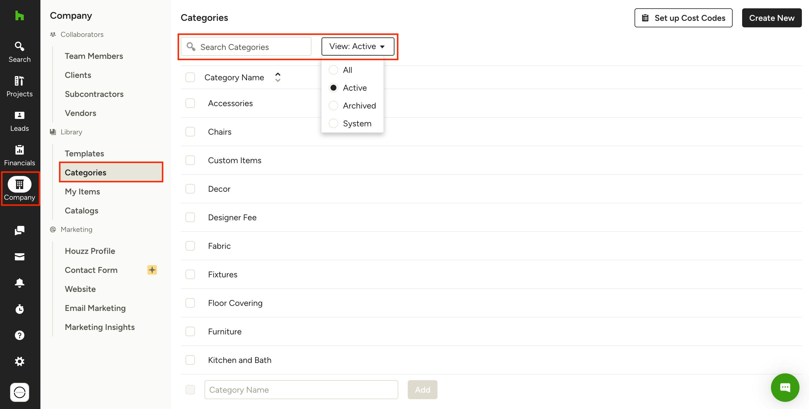 You can create a new category from multiple places across Houzz Pro, including the Categories page, My Items page and financial documents.