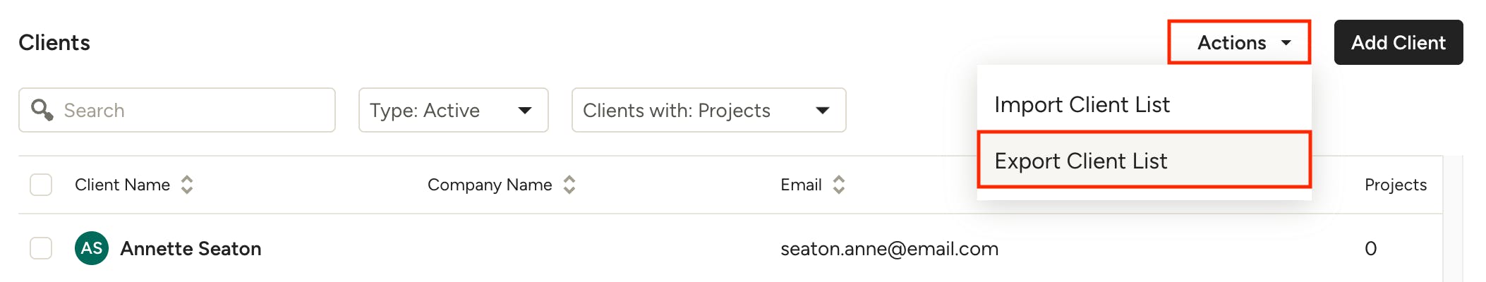 You can easily export your client list to use in other tools, such as in MailChimp or another marketing platform. To do so, click on Actions in the top right and select Export Client List. Your list of clients, along with all of their details, will be exported as a .csv file.