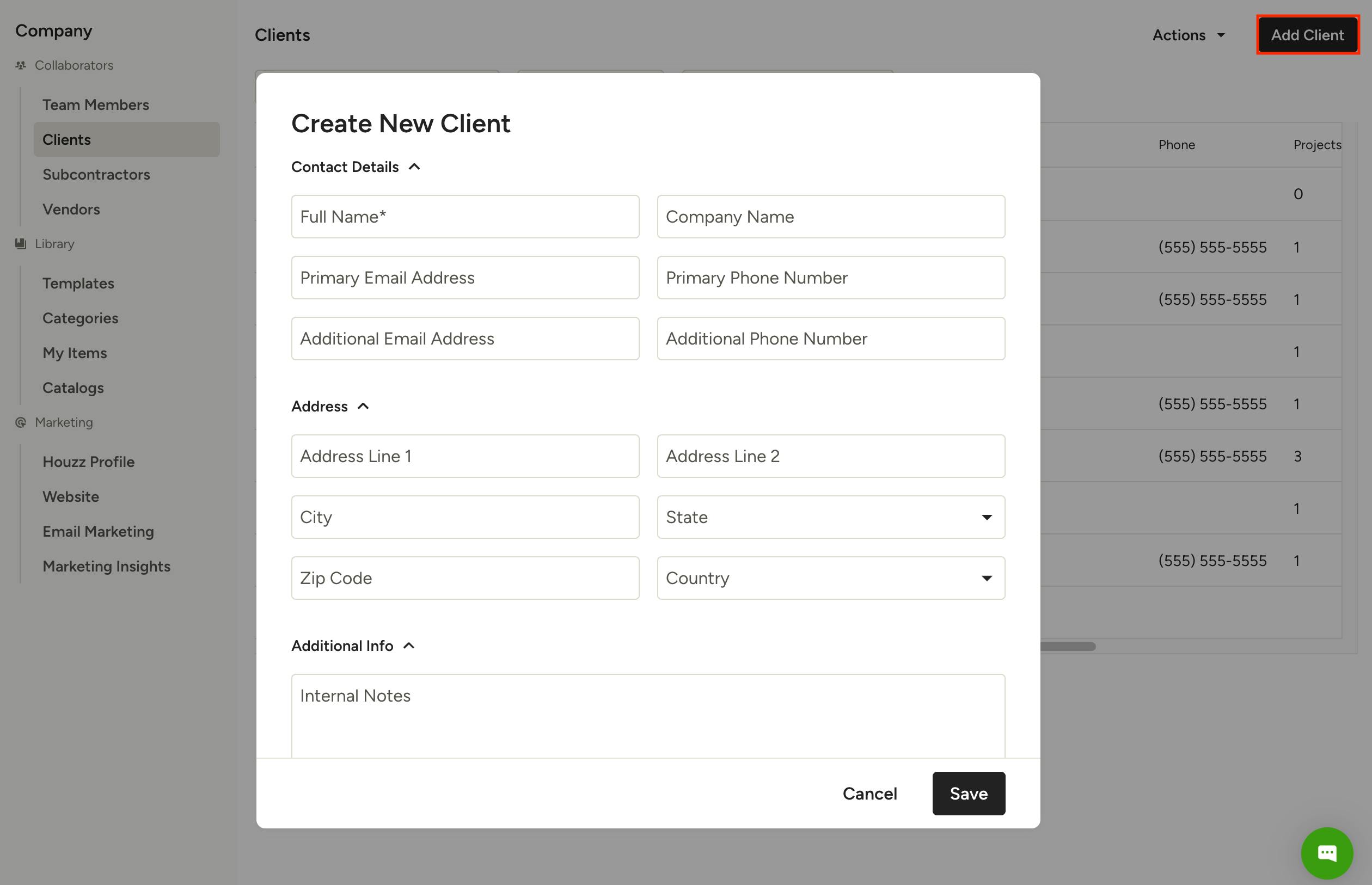 Your client information — emails, phone numbers, addresses — is crucial to running projects smoothly. In Houzz Pro, we've made managing your client details simple, so that you can focus on the progression of the project and not worry about tracking down contact info.