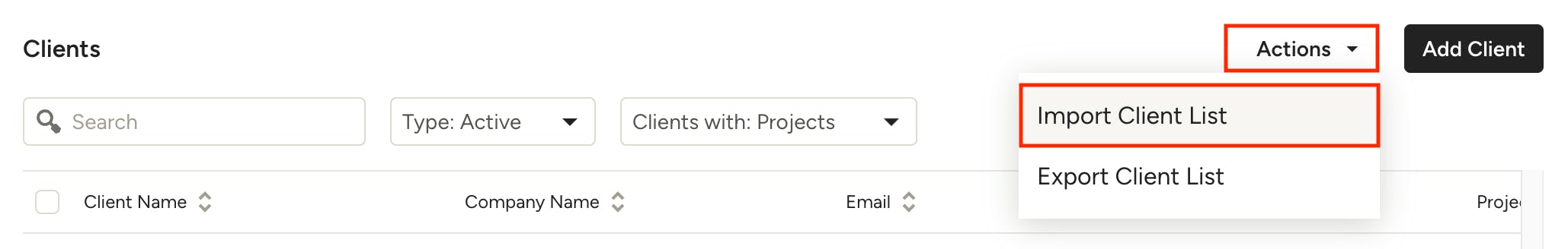 To import a list of clients using an XLS, XLSX, or CSV file, click Import Client List under the Actions menu in the top right. Learn more about the process of uploading a client list in How to Import Your Clients.