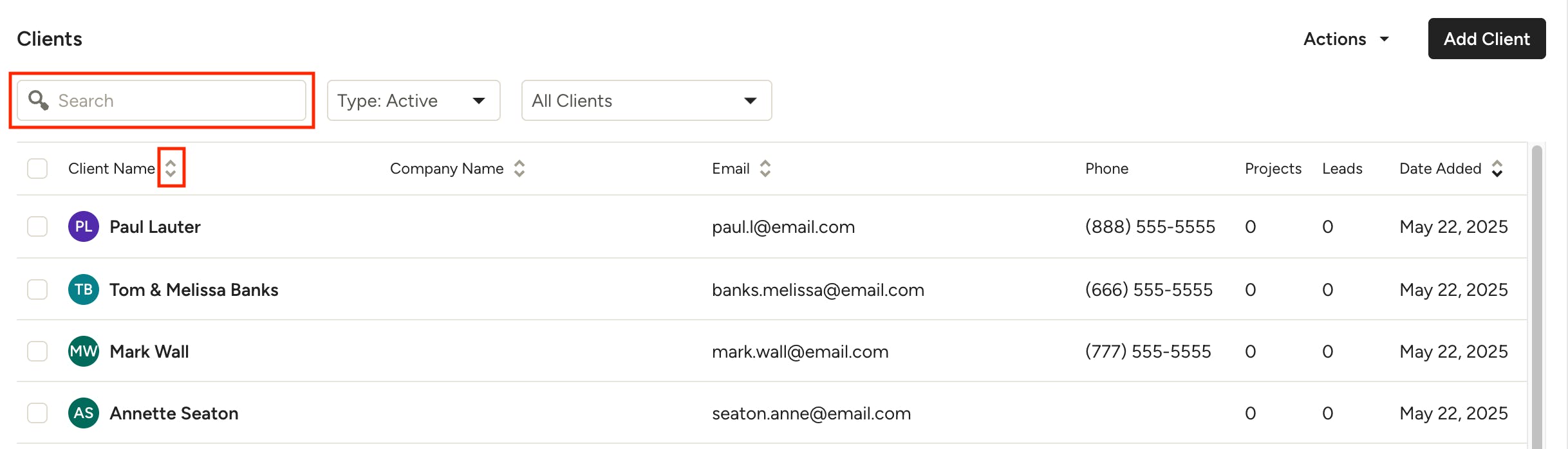 On the Client page, you can view all clients, including those with projects, leads or neither. You'll see an overview of each client for quick access to most used details, like email and phone number. Use the search bar to easily find a client, or click the arrows next to Name, Company, Email or Date Added to sort by that column.
