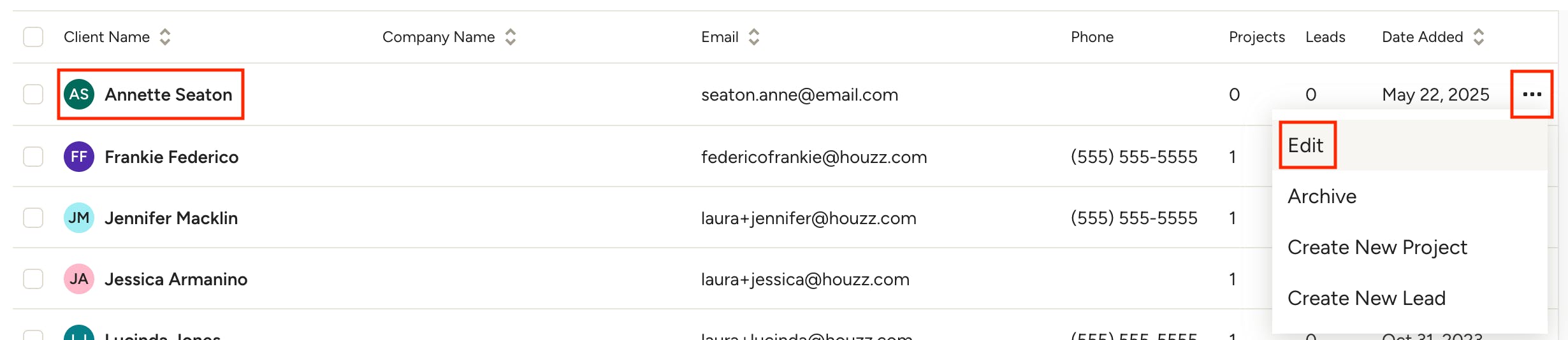 To view and edit a client's details, either click their name in the list, or use the three dots menu to the right of their info and select Edit.