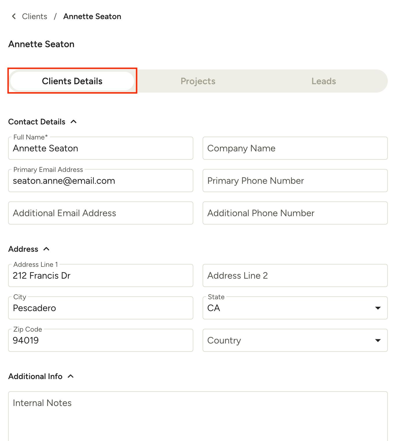 Within their client information, you will see three tabs at the top. Under the Clients Details tab, you can add or change any existing contact details, addresses and internal notes. Make sure to click Save at the bottom to save any edits you make.