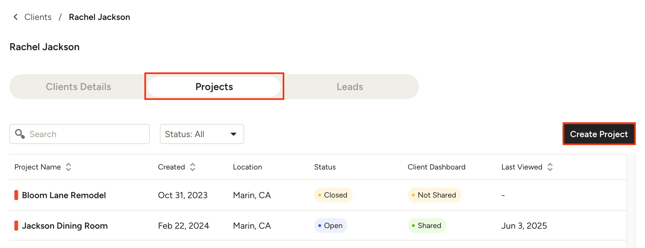 Under the Projects or Leads tabs, you can see any projects/leads the client is assigned to, as well as project status and whether the client dashboard has been shared or not. Click on a project name to open the project overview page. You can also create a new project/lead for the client by clicking Create Project (or Create Lead) and entering a project/lead name; the client details will be automatically filled in.