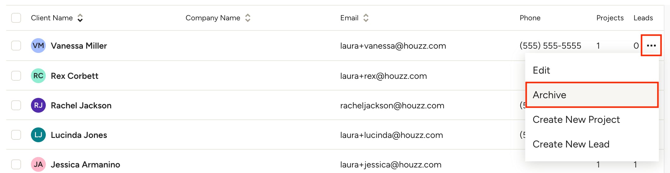 If you have duplicate client entries, you can archive the one that's not assigned to any project or lead — look for the one with zeroes in both the Projects and Leads columns.