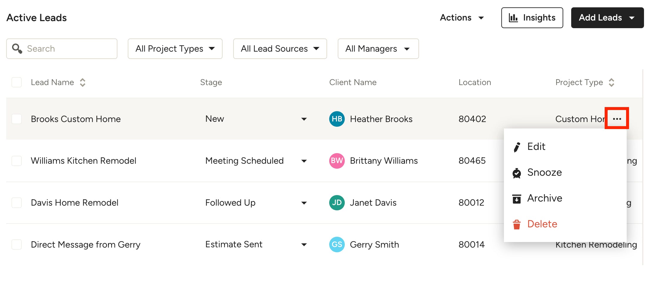 If you need to edit or delete a lead, you can easily do this from your leads list. Select the three dots icon to the right of your lead — from there, you can select Edit, Snooze, Archive or Delete.