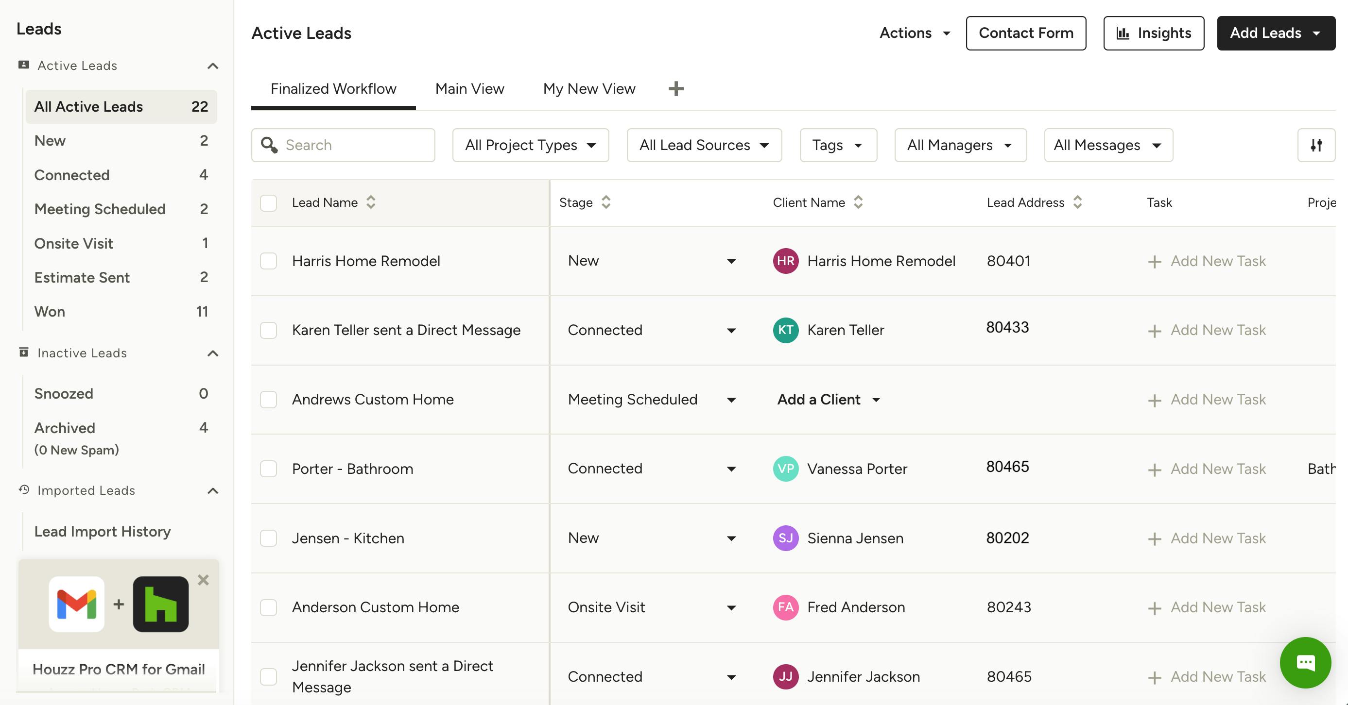 When you’re contacted through Houzz Pro about a potential project, a lead will automatically be added to your New leads stage.