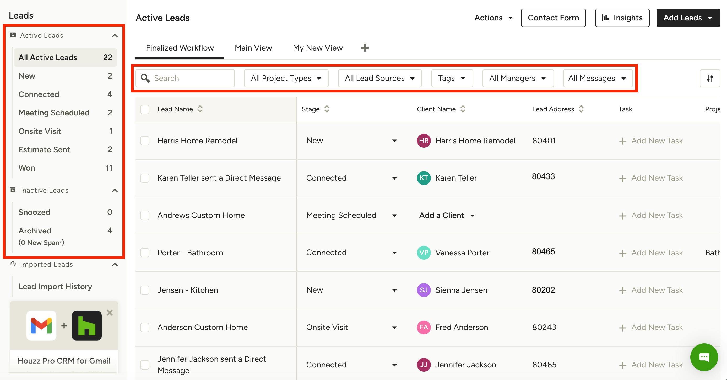 Within the Leads section of Houzz Pro, you can easily manage your lead information and communication to ensure your business stays on top of all potential clients. With messages, notes, files, estimates/proposals and more, you have the best possible tools available to convert leads to actual clients.