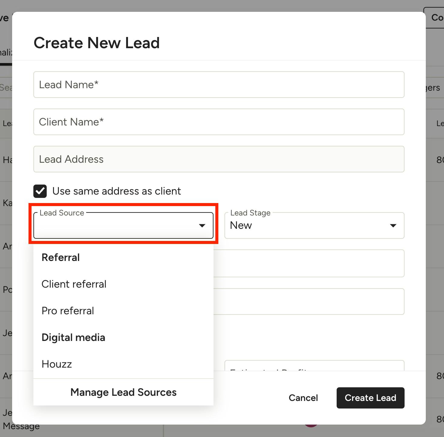 You can also add your own custom lead sources by clicking on Manage Lead Sources at the bottom of the dropdown menu.