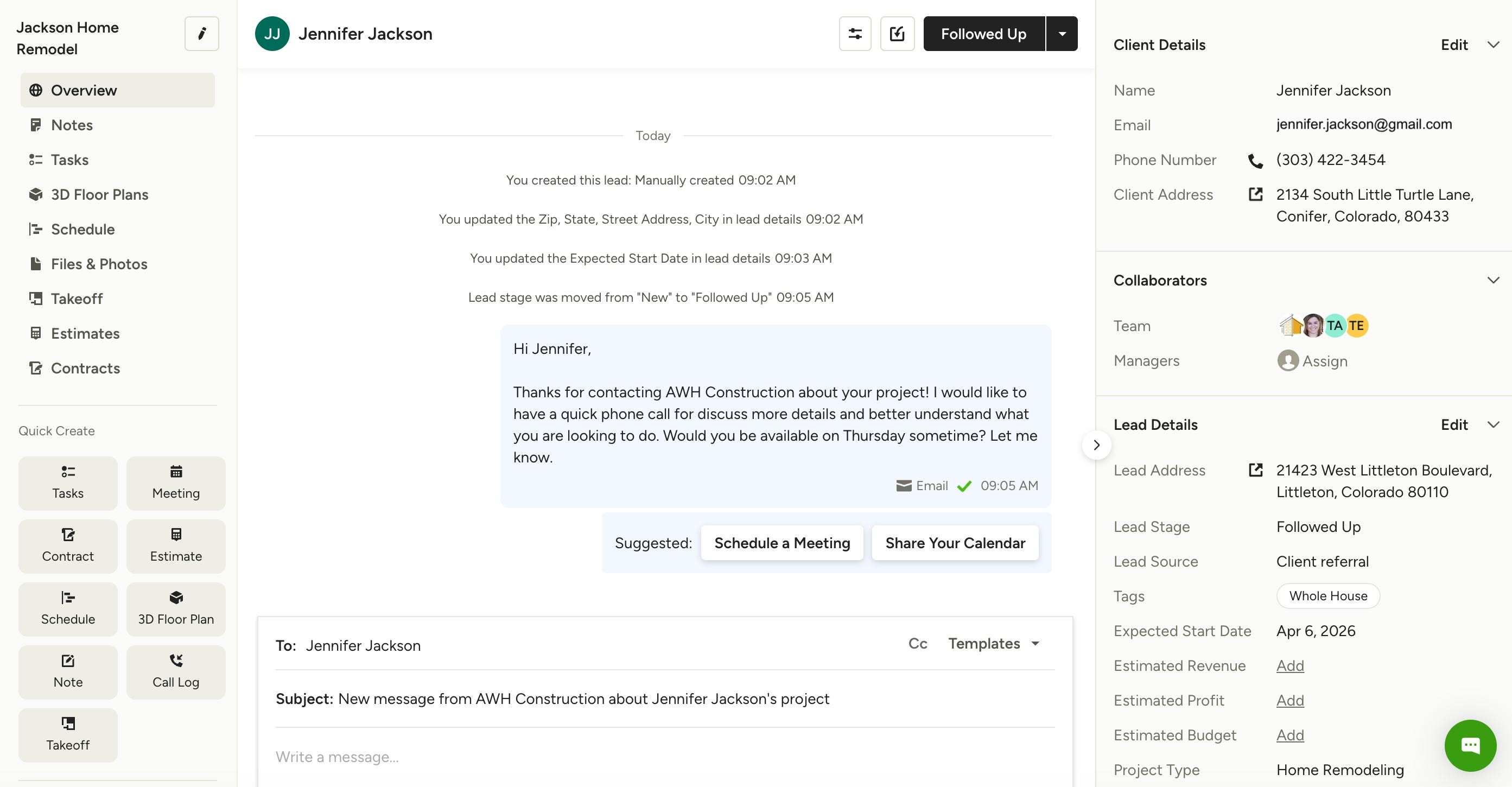 On the left side of this page, you can navigate to relevant project features, including project overview details, notes, tasks, 3D floor plans, schedule, files, takeoff, contracts and estimates / proposals. You can also use the Quick Create menu to quickly add a new task, meeting, contract, estimate/proposal, 3D floor plan, and more. You can convert to a project if the lead is won, and you can Delete, Archive, Print or Snooze under More Actions.