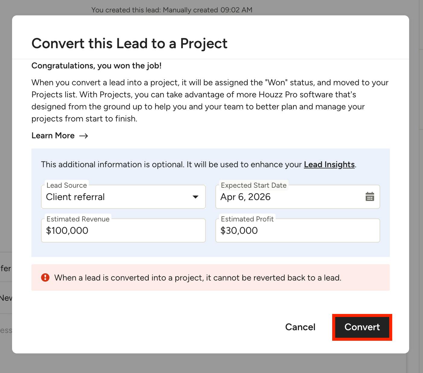 A screen will appear where you can input details on the project, including lead source, estimated start date, estimated revenue and profit. All this information is optional and is used for your lead insights, so you can keep blank if you prefer. Be sure to click Convert to complete.