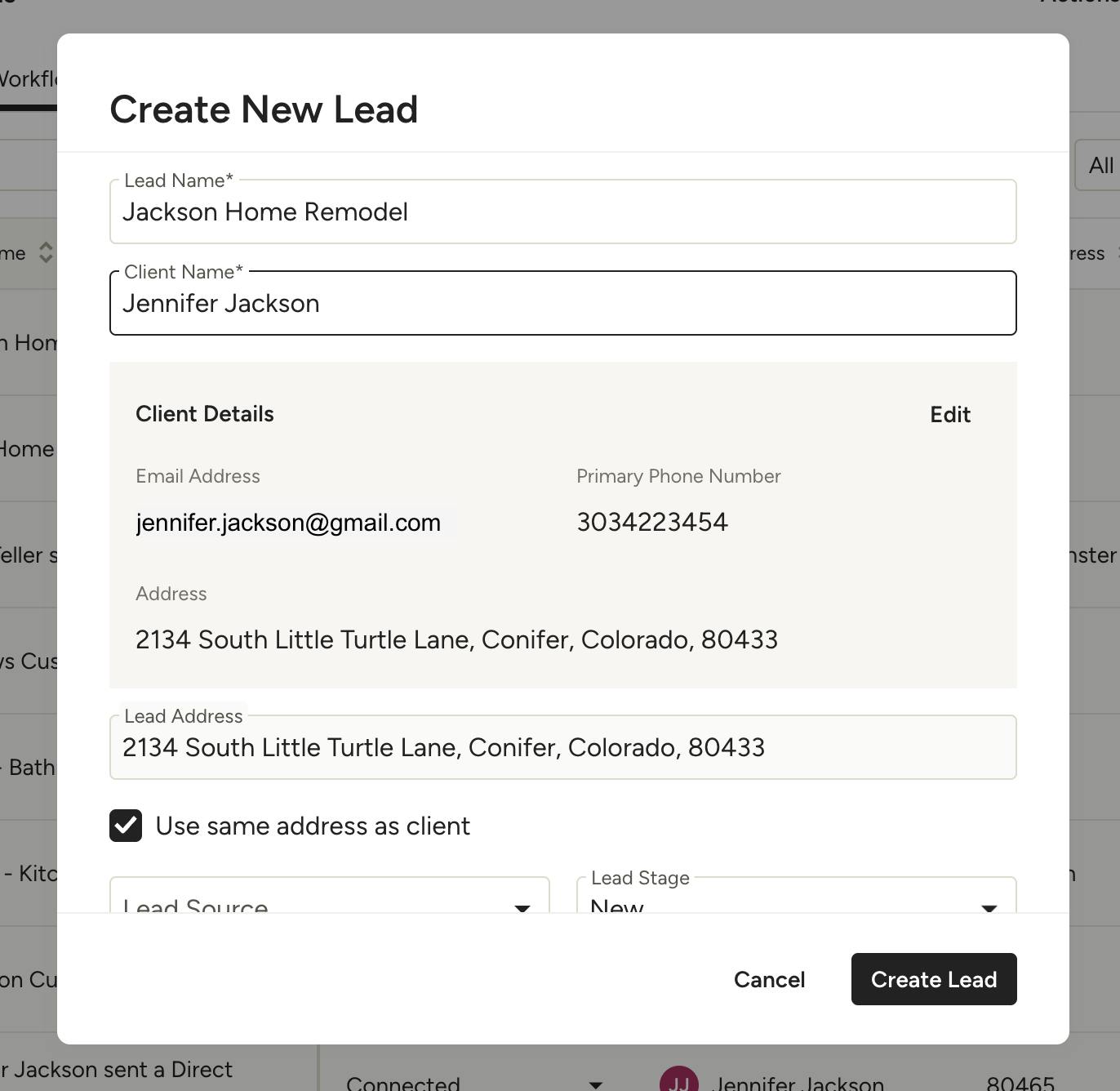 Your lead will now appear listed as a project. When converting to a project, the listed lead address will now become the project address.