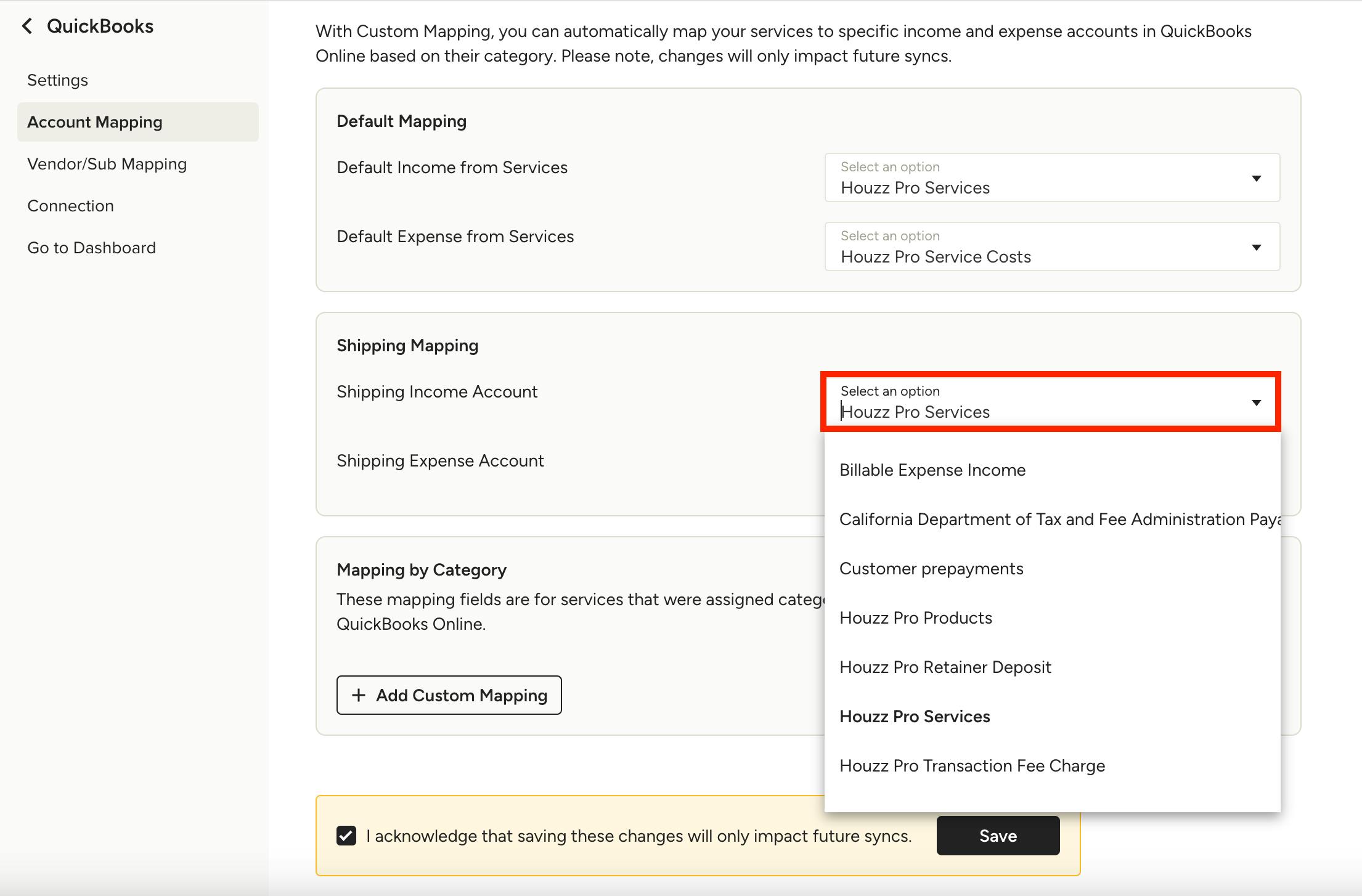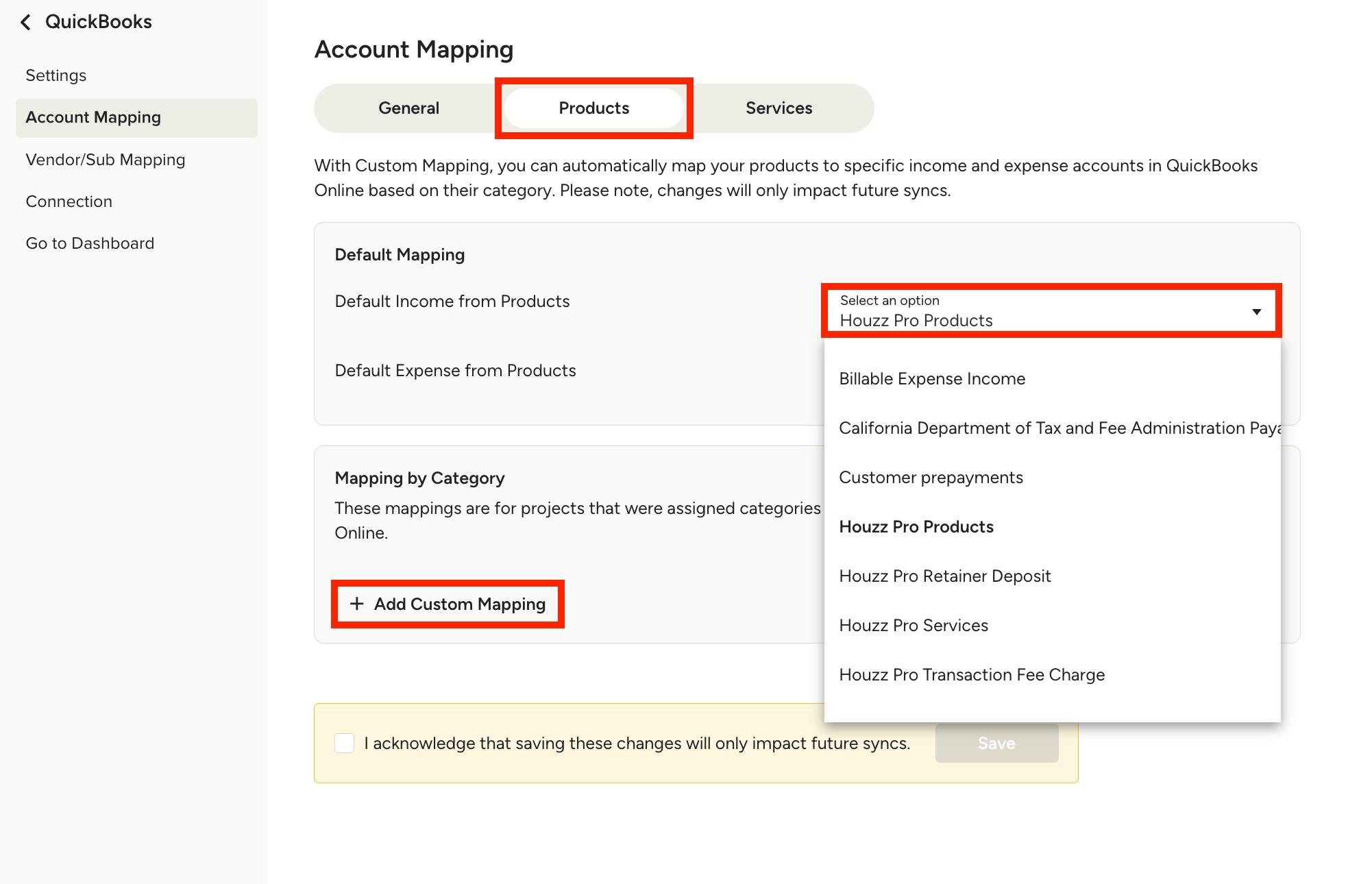 Making sure that the account mapping from Houzz Pro to your QuickBooks Online account is one of the most important first steps in setting up the integration.