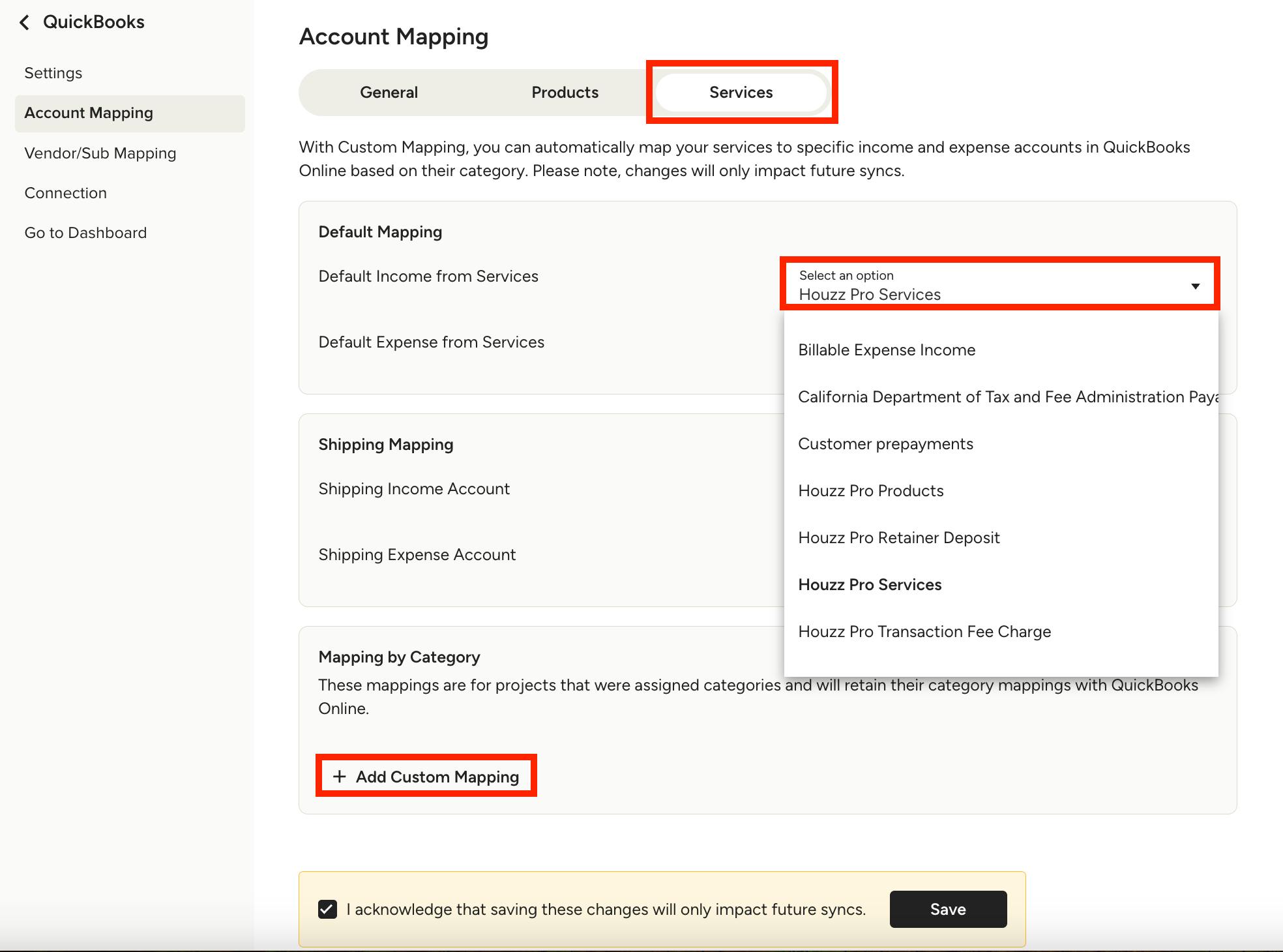To set up custom mapping, select the Add Custom Mapping button. Custom mapping allows you to map services based on their category to distinct income and expense accounts in QuickBooks Online. Once a new custom mapping is added, be sure to select the checkbox at the bottom of the page, then click Save.