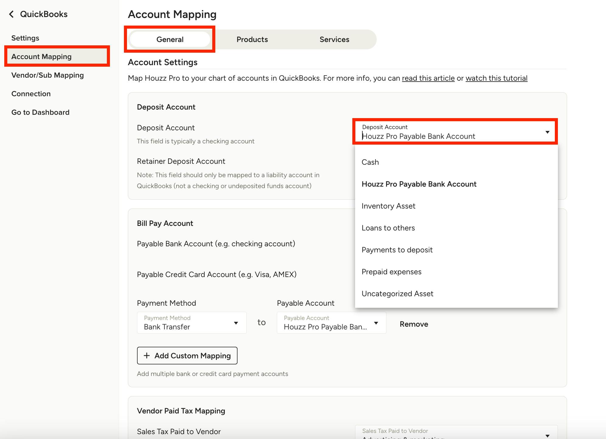 If you would like to adjust your mappings, select Account Mapping. Here under the General tab, you can map Houzz Pro to your chart of accounts in QuickBooks Online. This includes your Deposit Account, Bill Pay Account, Vendor Paid Tax Mapping, and Payable Account.