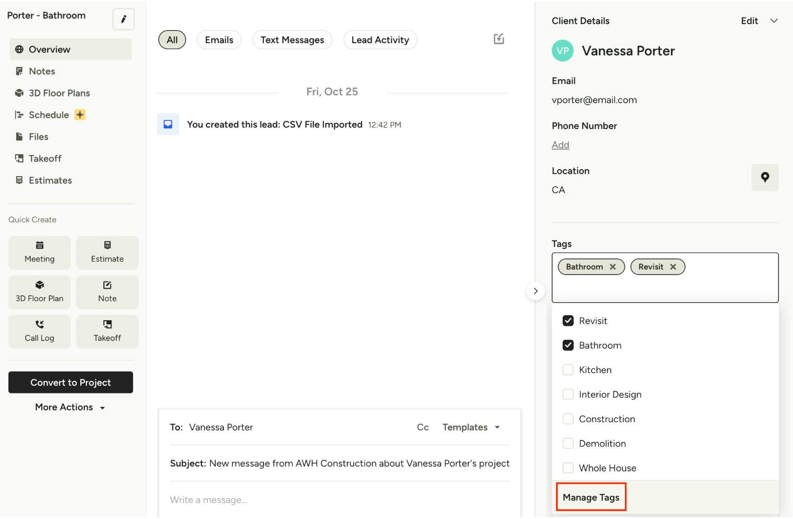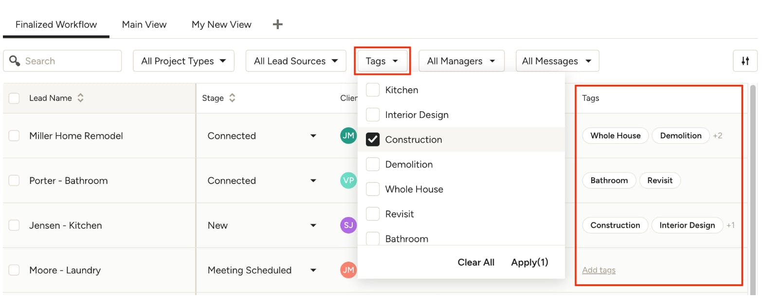 Keeping on top of your leads is a key part of running an efficient and successful business. With Houzz Pro, you can use tags to organize your leads. Tags allow you to customize how leads are grouped so they best support your company's workflow and internal process. They help you organize your leads in an easy-to-understand way so you can win jobs and convert more leads to projects.
