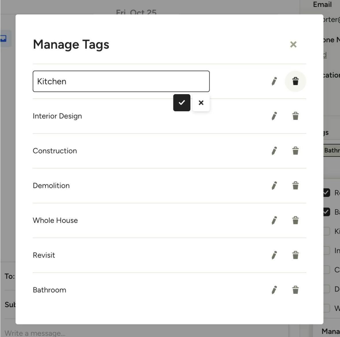 In the Manage Tags modal, you can click the edit icon to change a tag name, or click the trash icon to delete a tag. Deleting a tag will remove it from leads it is currently applied to and cannot be undone.
