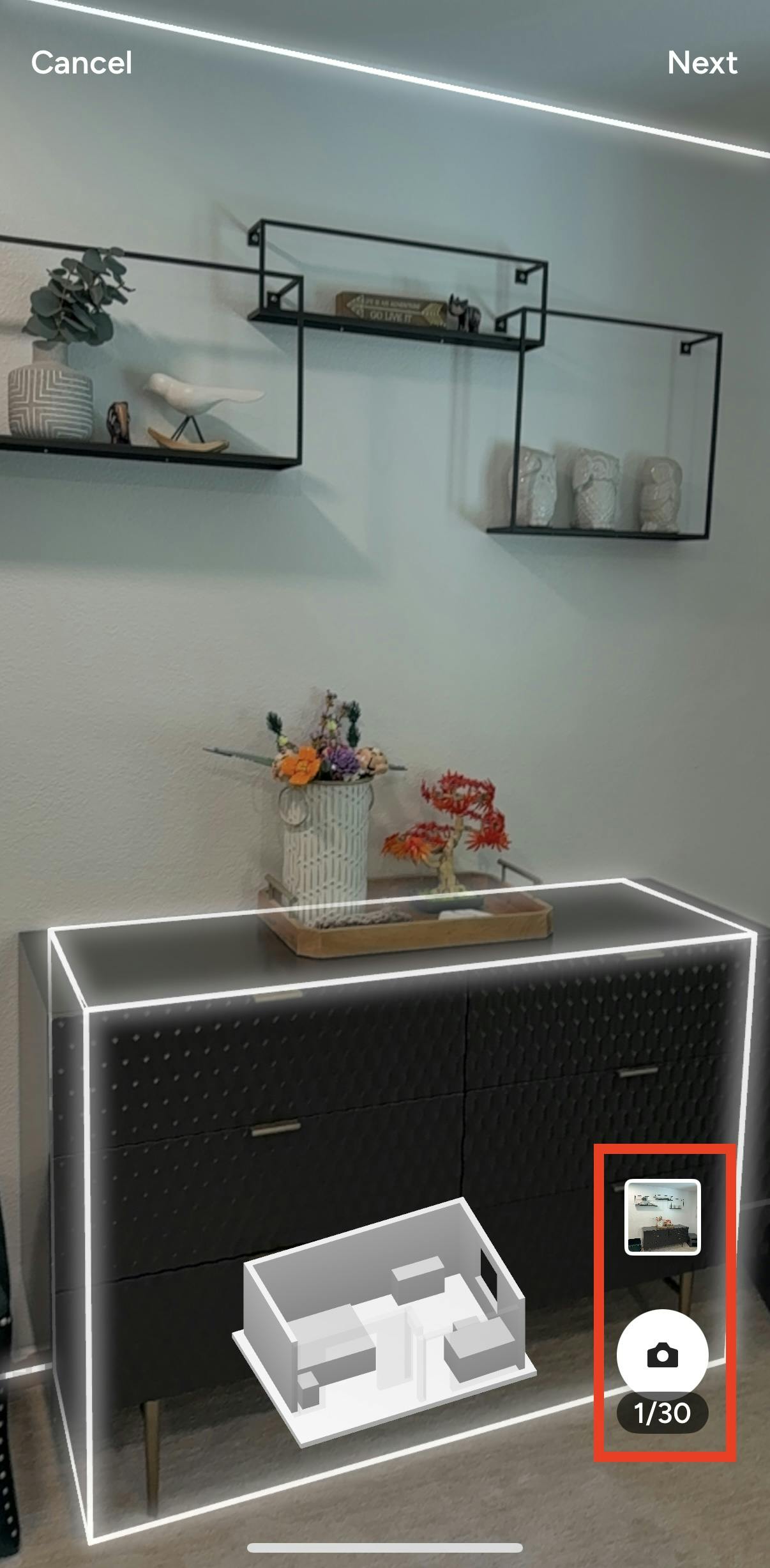 As you start, scan the room at a steady pace, gently moving your iPad or iPhone Pro up and down to capture every angle. Be sure to capture all the corners and edges of your ceiling, flooring and architectural features in the space. The scan will also capture the furniture in the room, which you can decide to include or remove later on.