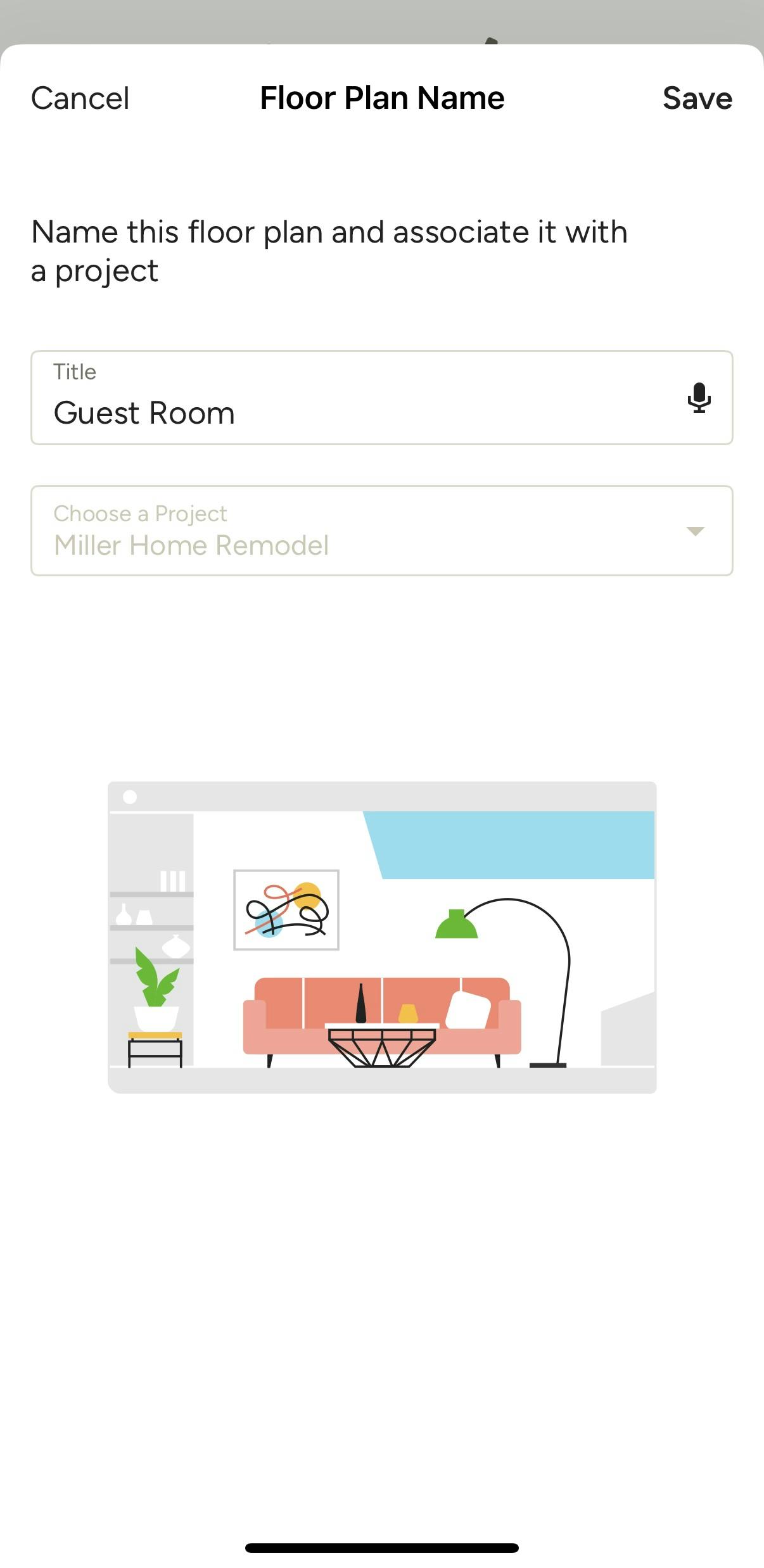 In the next screen, tap Yes to save furniture, and No to not save the furniture. You will then need to name the floor plan and associate it with a lead or project (if not already selected). Tap Save at the top to complete the scan.