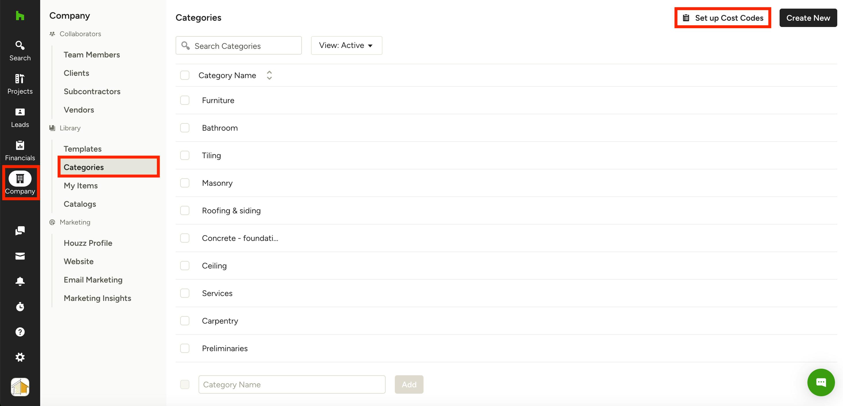 To start, click on the Company icon in your left navigation, then select Categories from the menu. At the top of the Categories page, select Set Up Cost Codes.