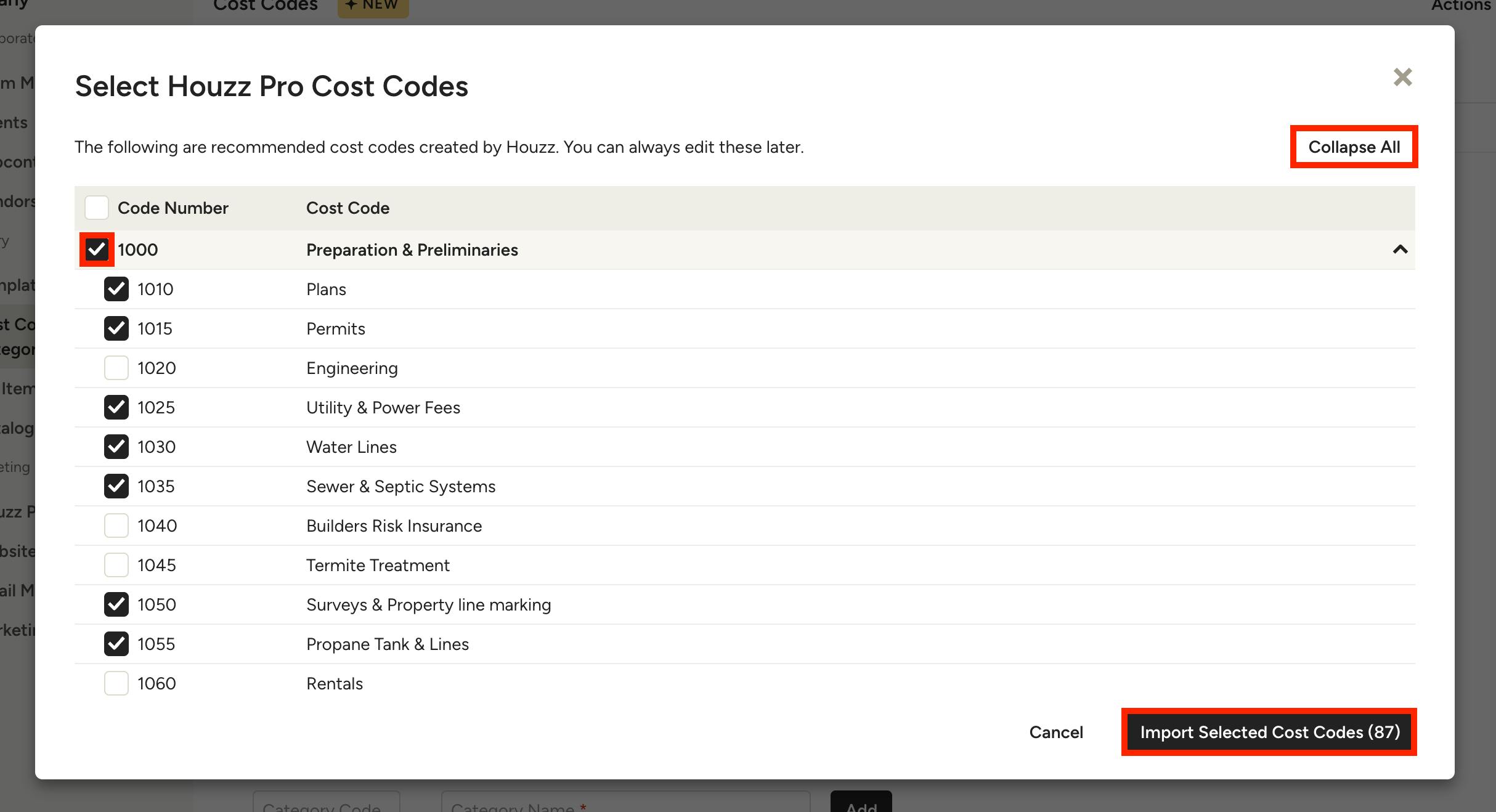 The selected Houzz Pro Cost Codes will now appear in your account to use — you can continue to make edits or add new cost codes if needed.