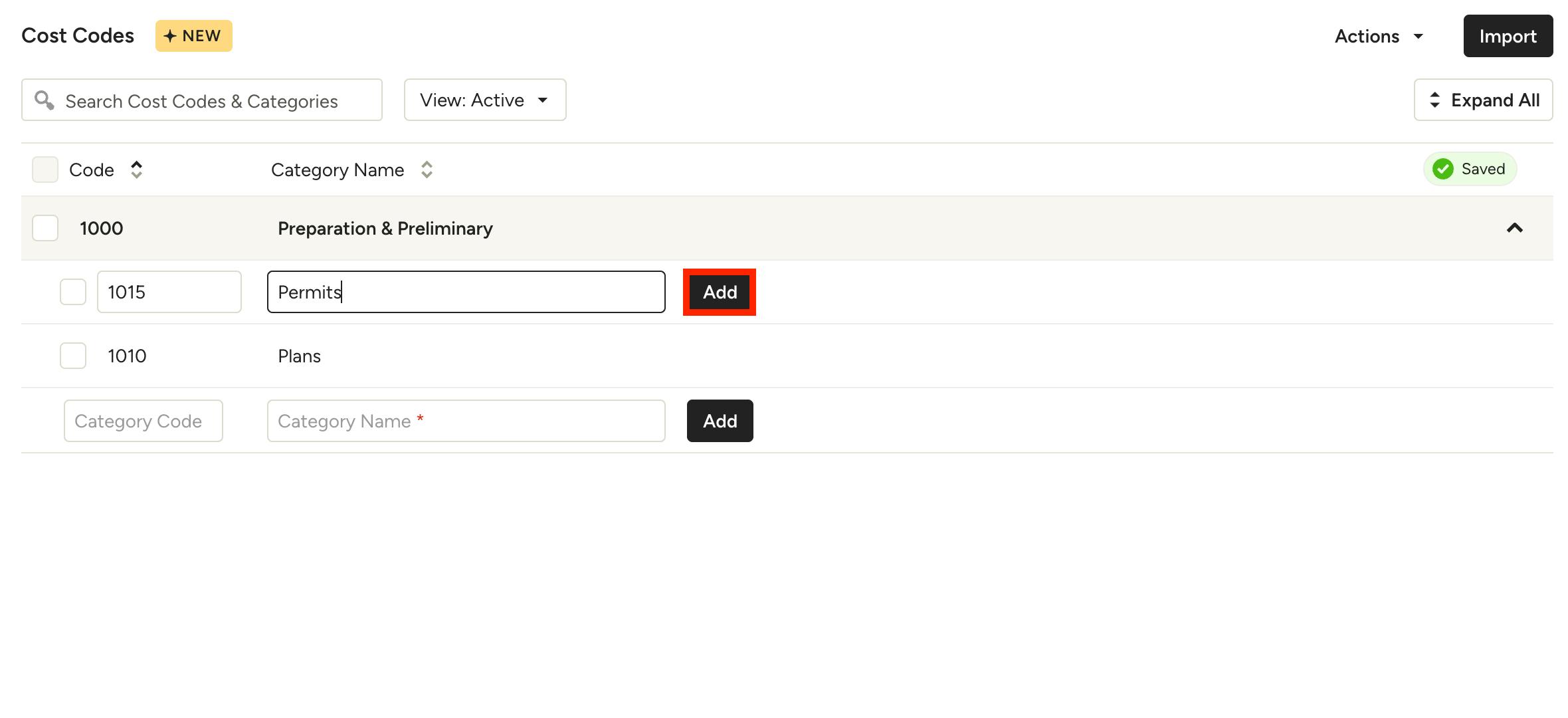 To start, go to the Cost Codes page, then type in the Category Code and Category Name that you would like to create. Click Add.