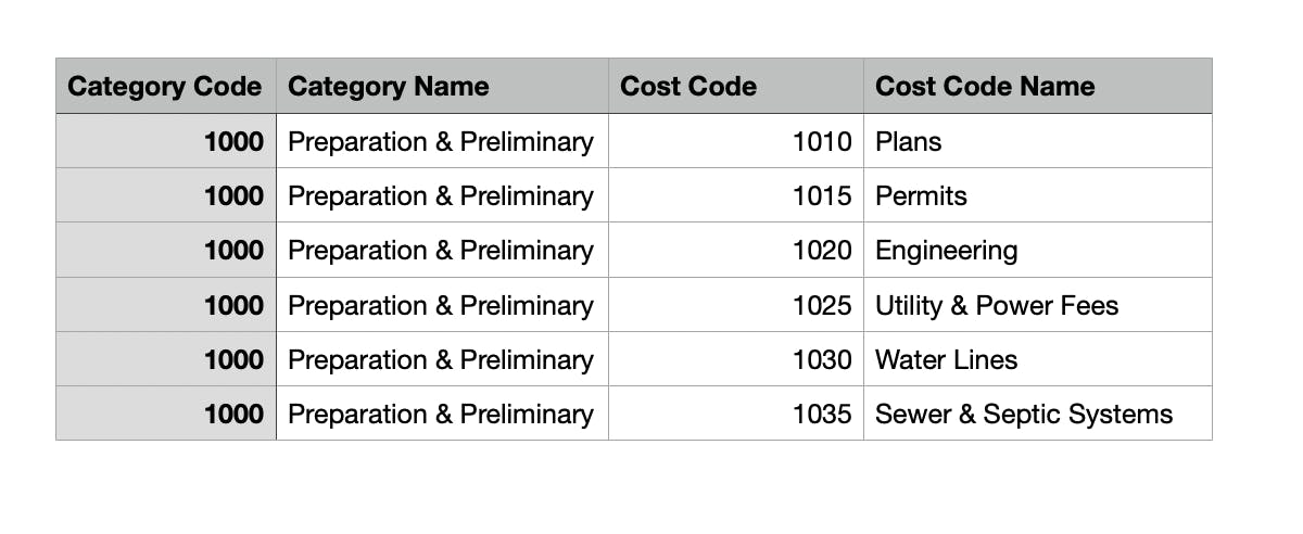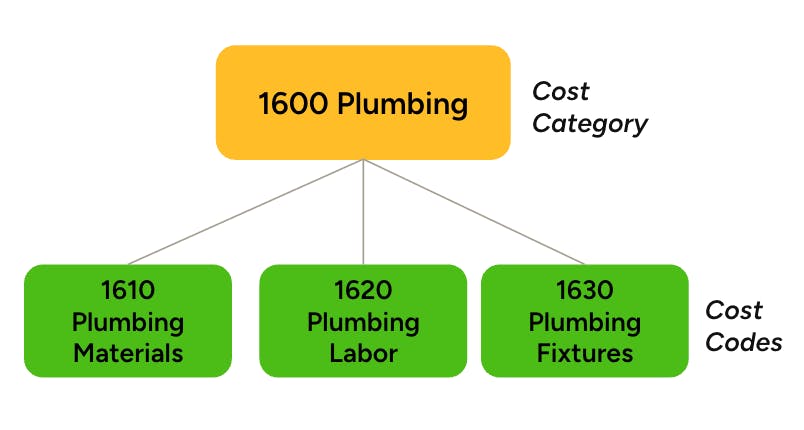 A Cost Code is a more specific grouping that is stored under a broader cost category, such as plumbing materials, plumbing labor, and plumbing fixtures.