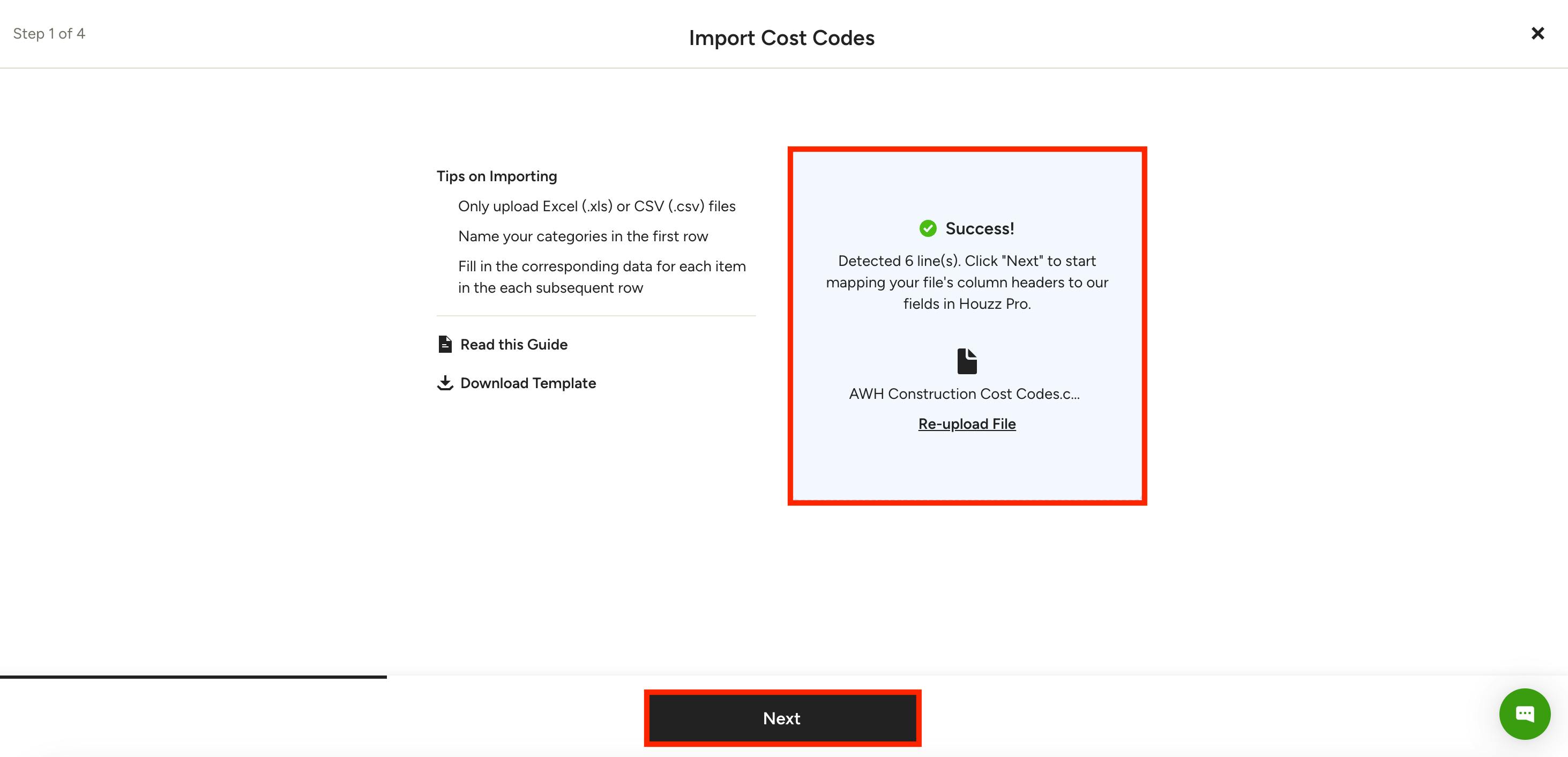 If you select My Existing Cost Codes, you will need to upload a file of existing cost codes that you would like to add to Houzz Pro. Be sure to click Download Template to ensure your file follows the correct format.