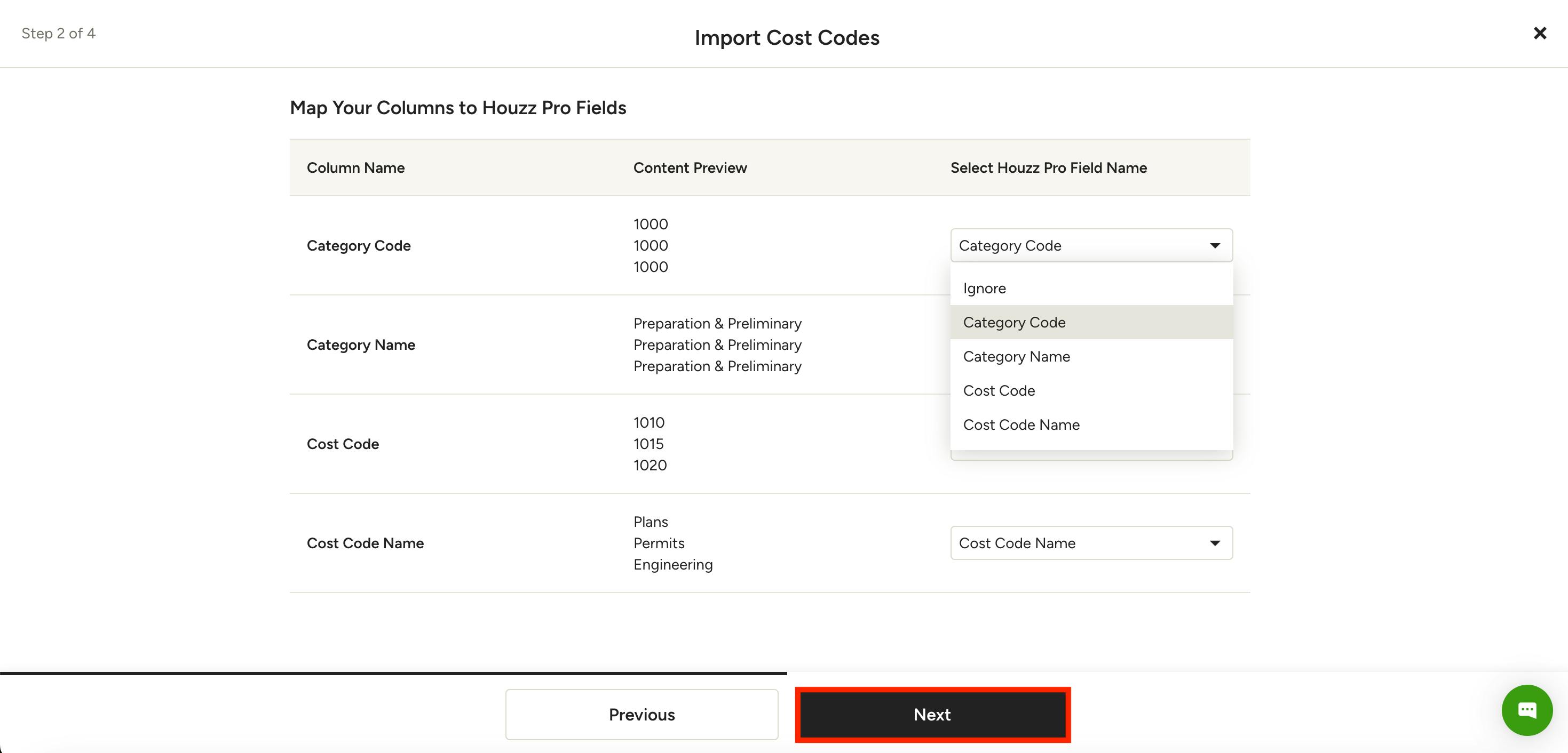 In the next screen, you will need to map your file’s columns to Houzz Pro fields. Review the mappings to ensure your columns align with the correct Houzz Pro fields. Only the columns you map will be imported; you can choose Ignore in the dropdown to skip importing certain columns. Click Next when you are finished mapping.