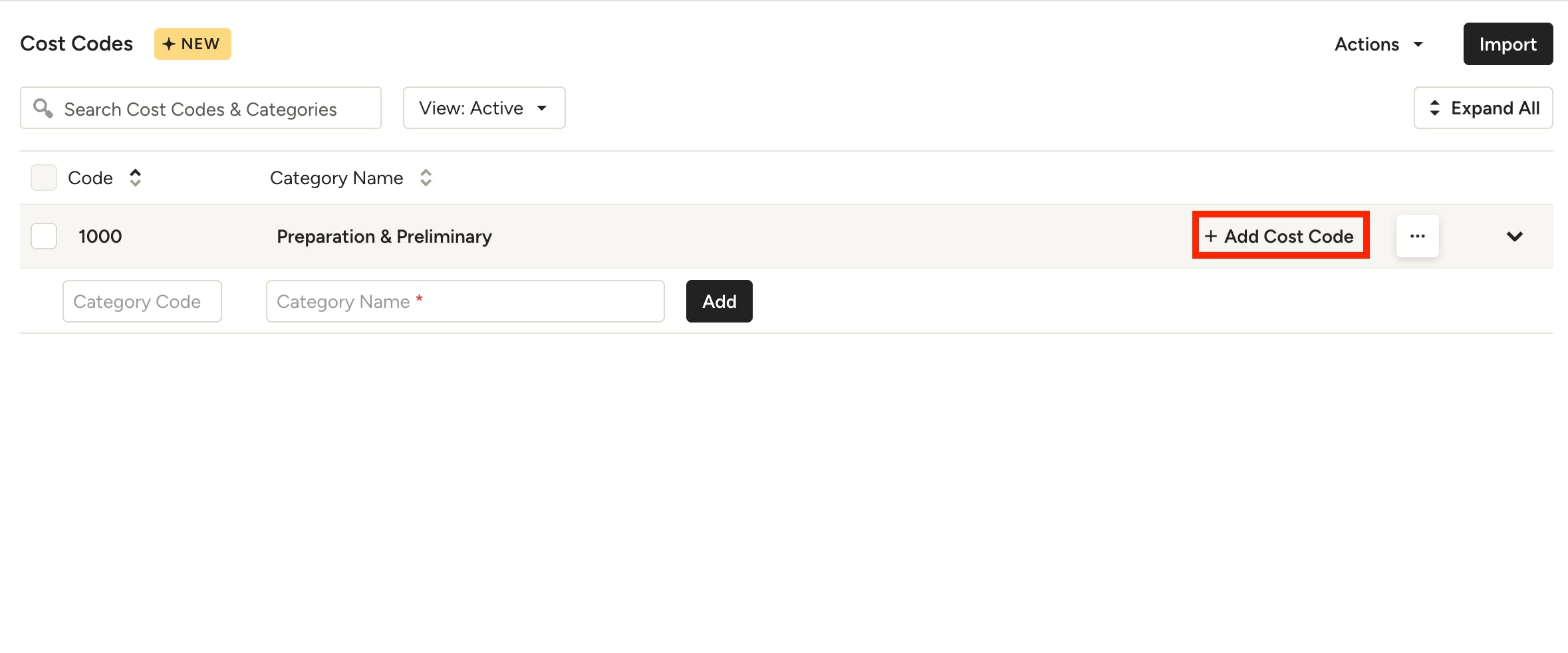 The new category name will appear under your Cost Codes list. To add more specific cost codes underneath this category, click Add Cost Code.