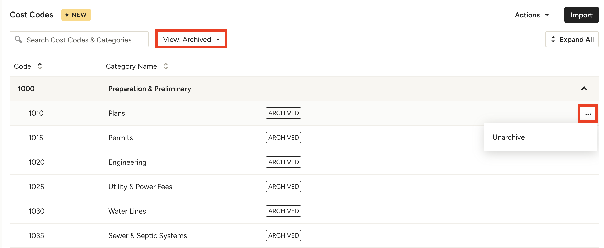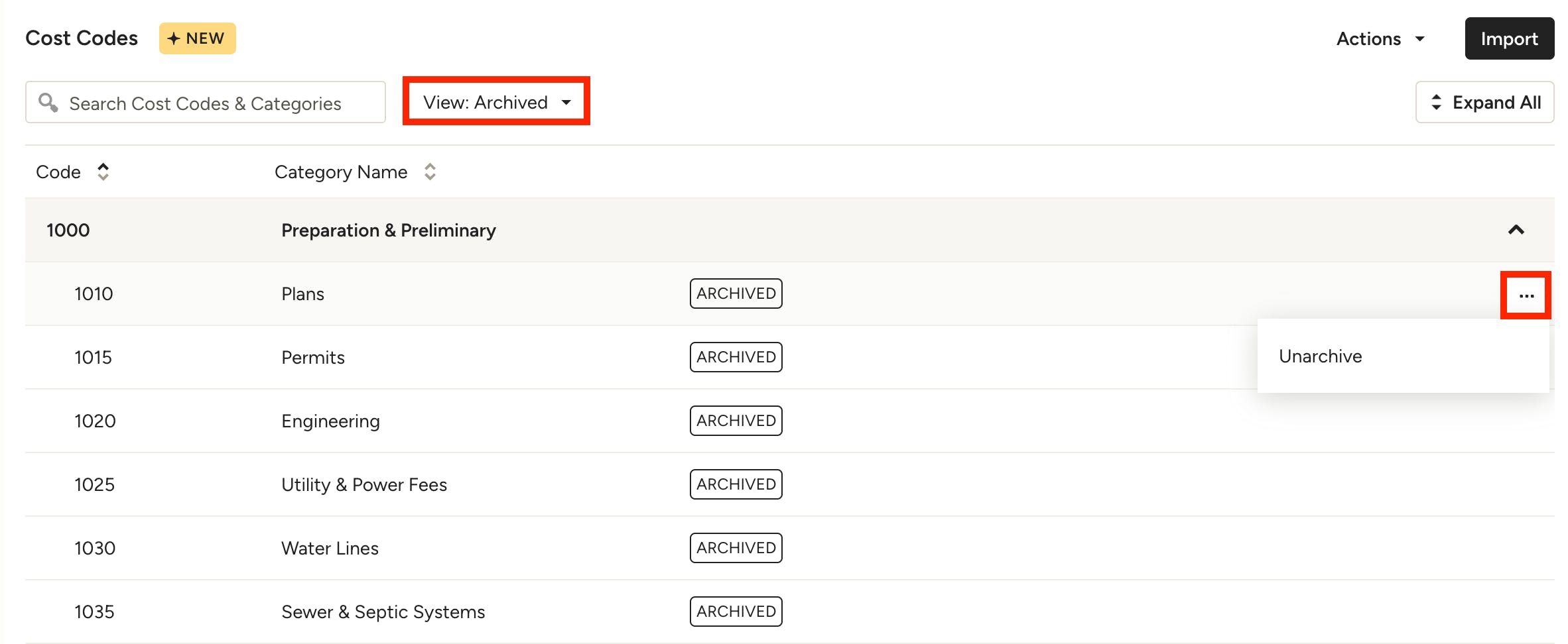 If you would like to unarchive and activate again, find the View filter at the top of the Cost Codes page, then select Archived from the dropdown menu. Click the three dots icon on the right side of the relevant cost code, then select Unarchive.