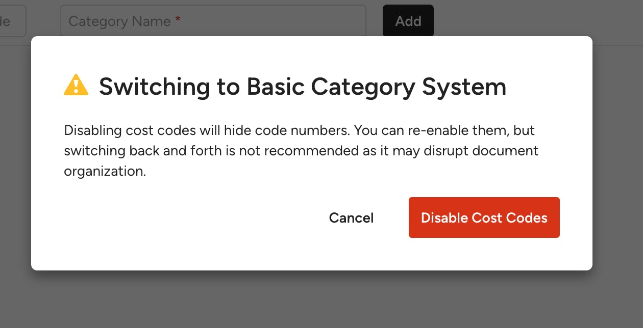 A new screen will appear to confirm you would like to disable cost codes. Click Disable Cost Codes to continue.