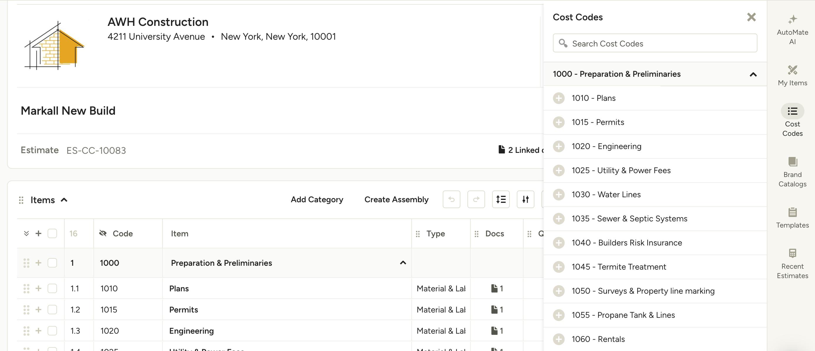 - Estimate by Cost Items: Detailed line-item pricing that is more granular