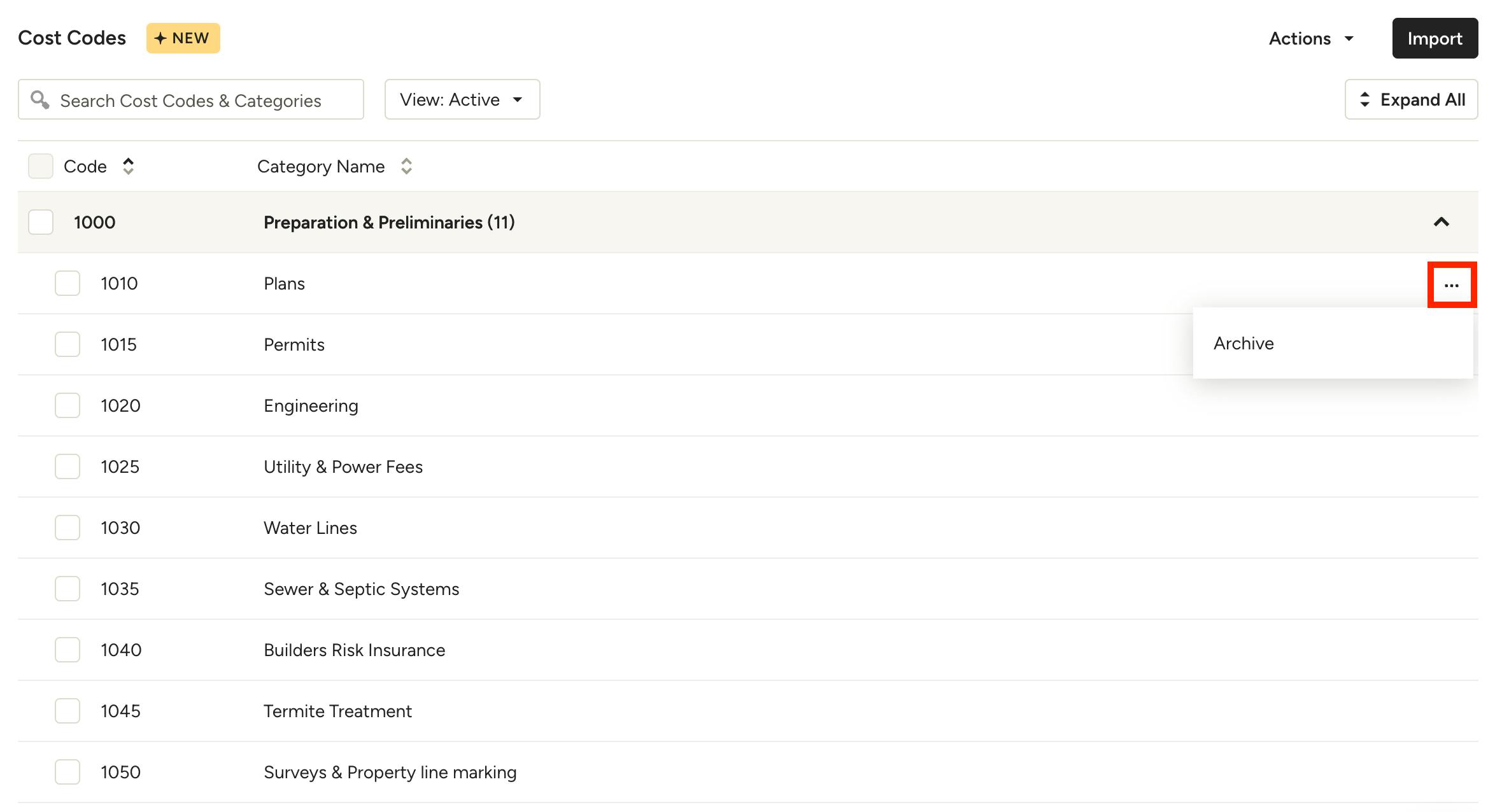 To start, find the relevant category or cost code you want to remove. Find the three dots icon on the right side, then select Archive.