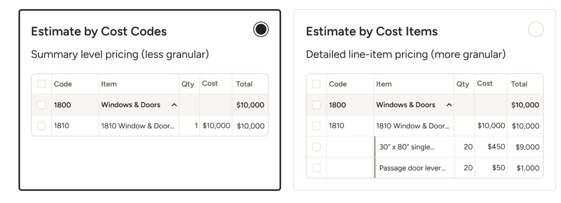 - Estimate by Cost Codes: Summary-level pricing that is less granular