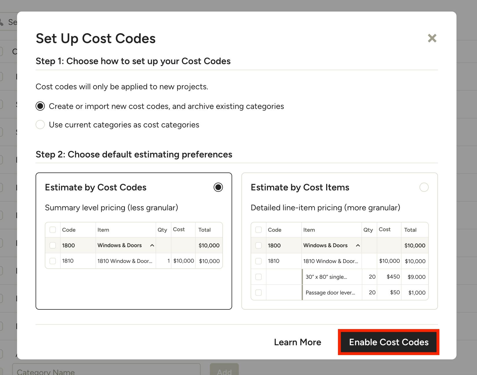 Select the circle next to the preferred option, then click Enable Cost Codes.