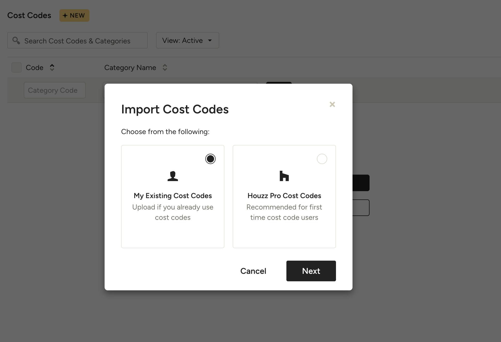 If you select Use Houzz Pro Cost Codes, you will be able to select from a list of suggested cost codes from the Houzz Pro template. Note that this option is not available for Canadian pros at this time.