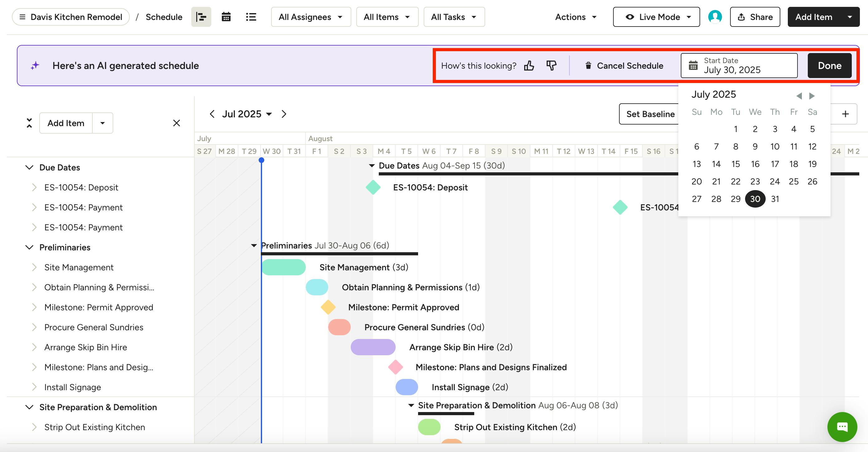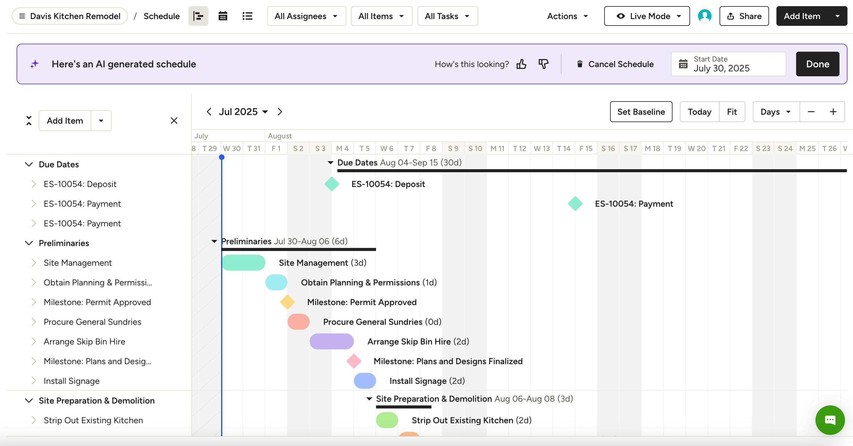 If you don't have an existing schedule for that project, AI will analyze your line items and create the schedule.