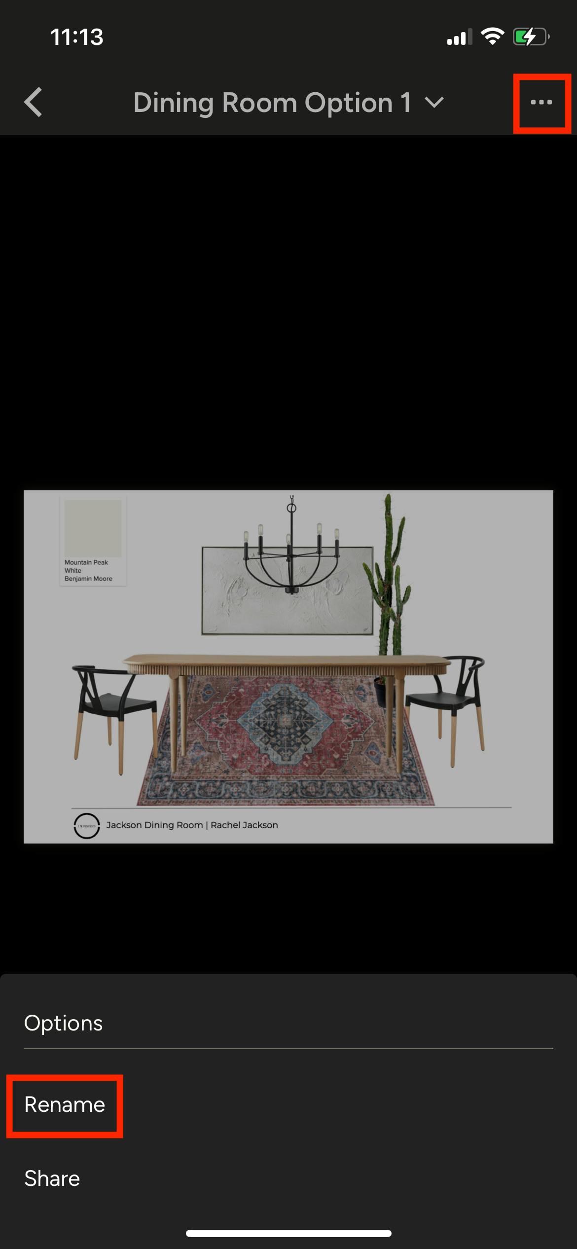 You can also rename a mood board in the app by tapping the Options icon (three dots) and choosing Rename from the menu. Any further edits need to be made in the desktop version.