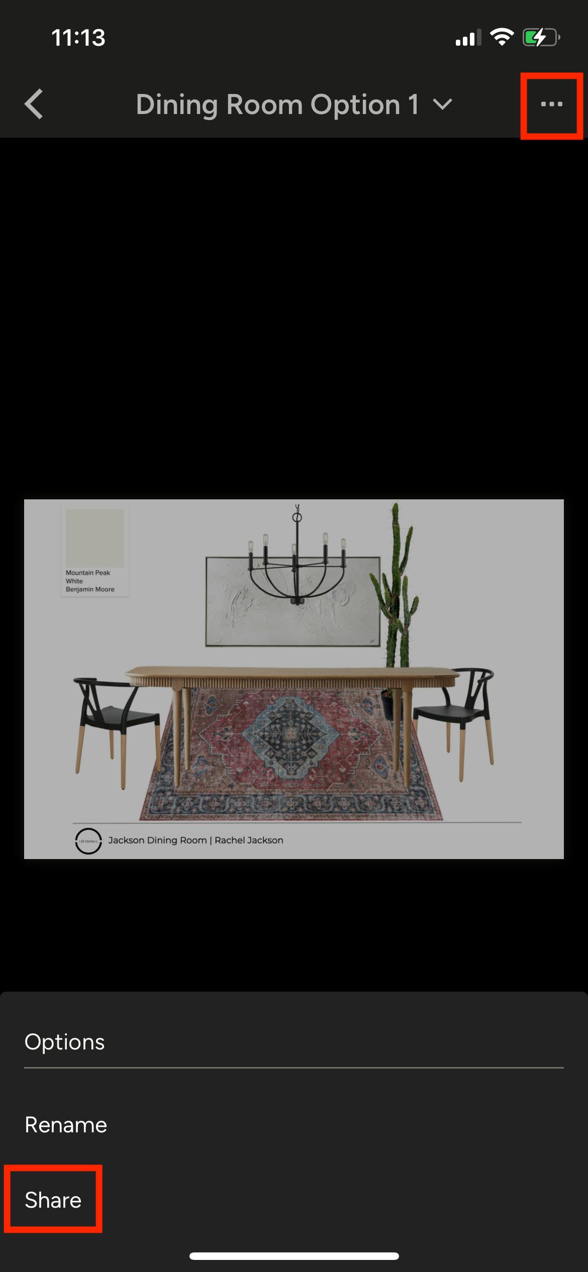 To share a mood board from the app, tap the Options icon (three dots) in the top right of the board and select Share from the menu.