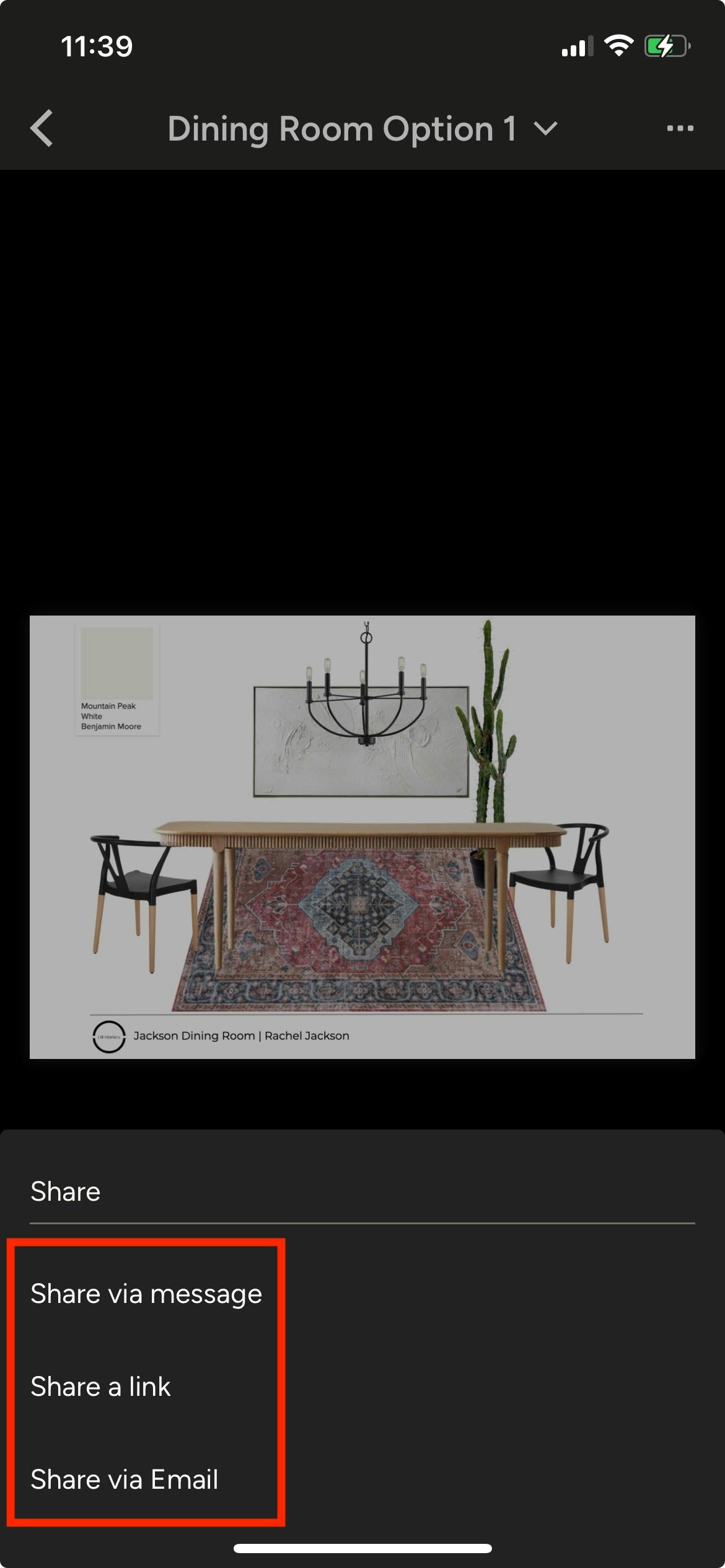 Next, choose the method you want to use to share the mood board: via message, via link, or via email.