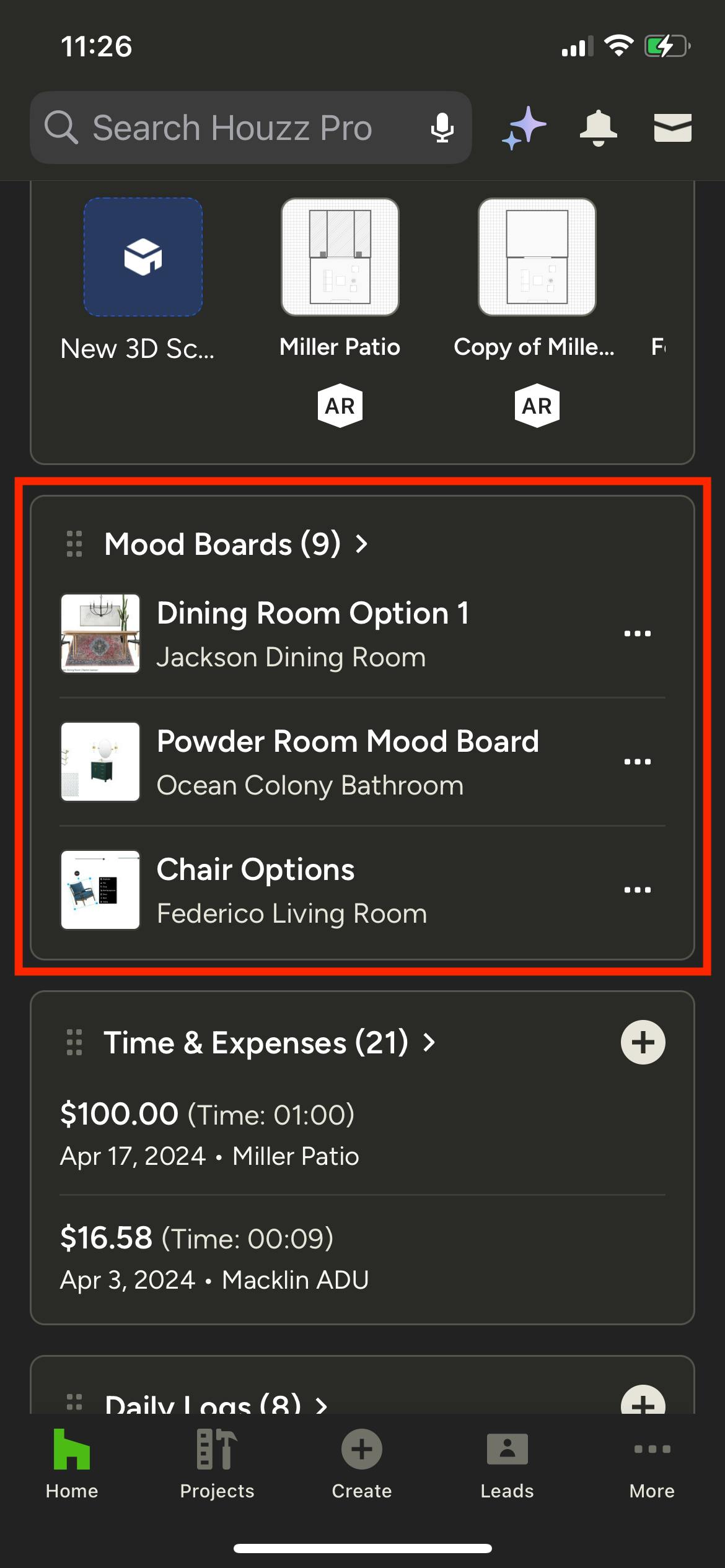 You can access your existing mood boards from the Mood Board section on either the homepage of the app (all mood boards) or a project overview page (project-specific mood boards). You may need to scroll down to find the Mood Board section. From there you can tap on an individual mood board to view it or tap the Mood Board title to see a complete overview.