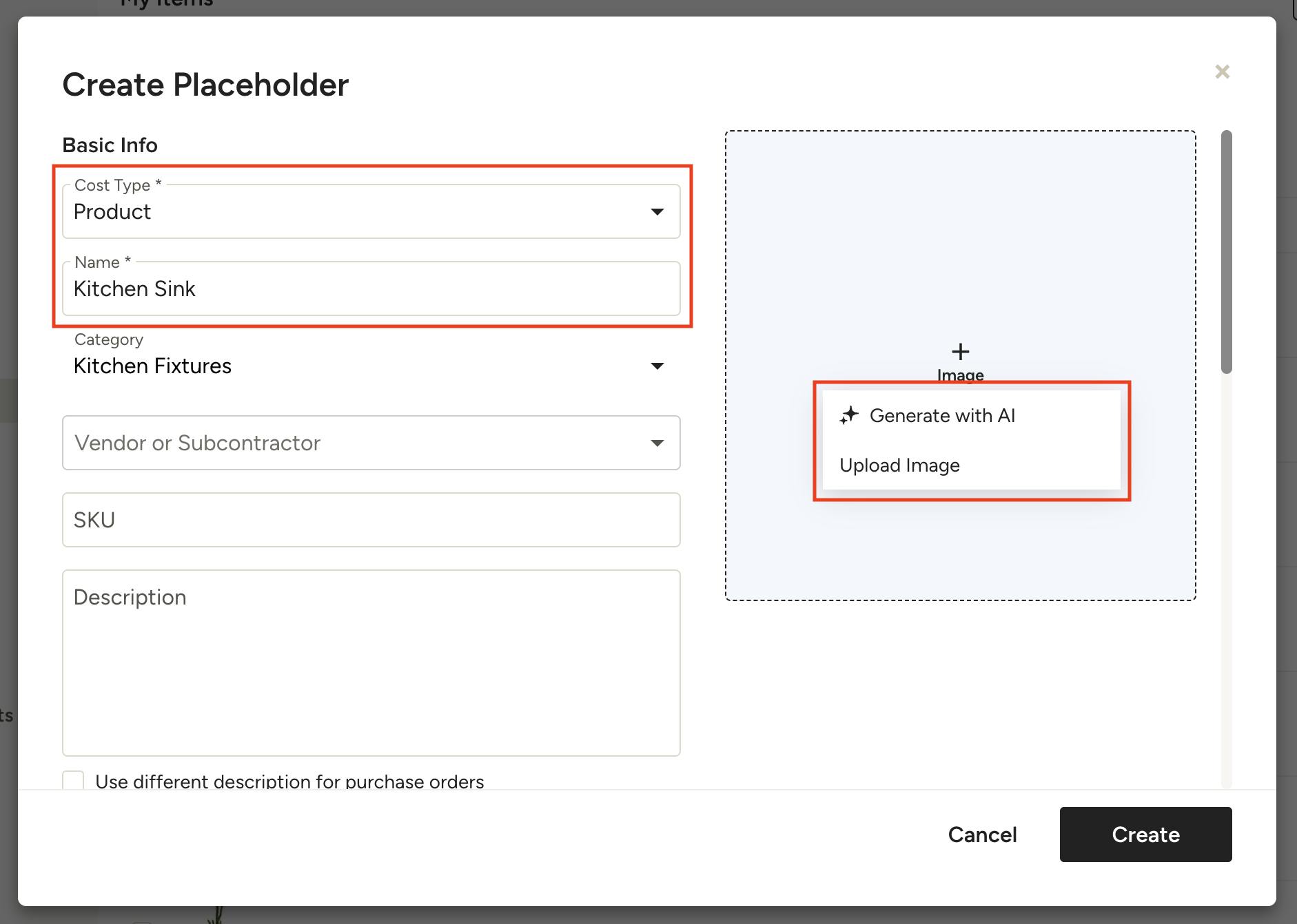 Select a cost type and add a name for your placeholder (like Kitchen Sink) and fill in as much additional info as you'd like. Placeholders are meant to be generic and you can add/update details like cost once they are on a selections board, so you don't need to get too granular at this stage. Upload an image or use our AI to generate one (more on Adding Images below). Click Create when you're done.