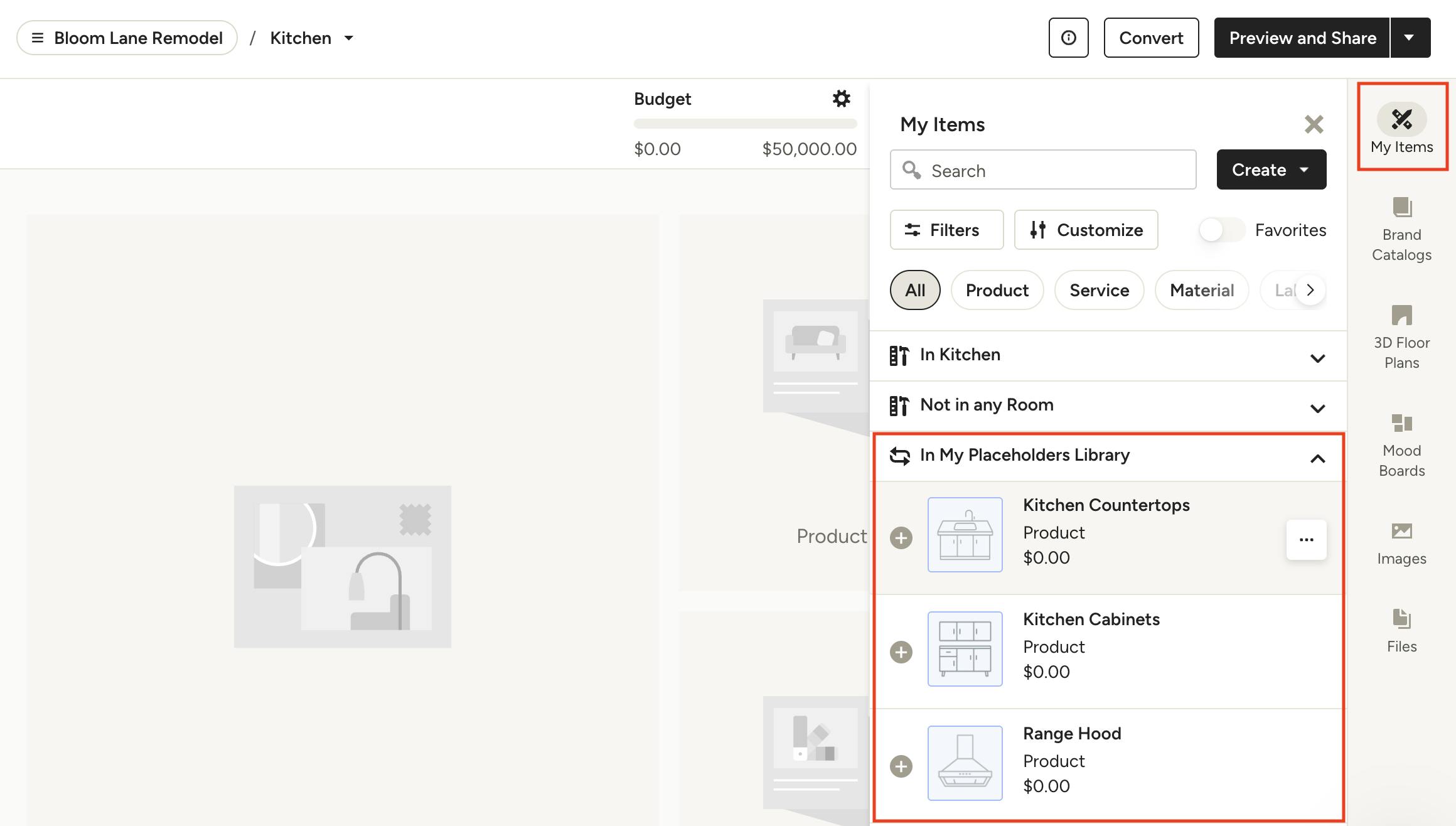 Placeholders are temporary stand-ins for products in Selection Boards and the Tracker. They allow you to plan for and communicate about selections before every product is finalized. By using placeholders early on in your project, you can ensure you build a complete list of necessary items (think rough selections, like “sofa” or “kitchen faucet”) and set clear allowances and budgets, before specific products are chosen. Then, once you've sourced the real product, the placeholders can be easily replaced without losing quantities or budget info, keeping you organized and professional throughout the whole selection process.
