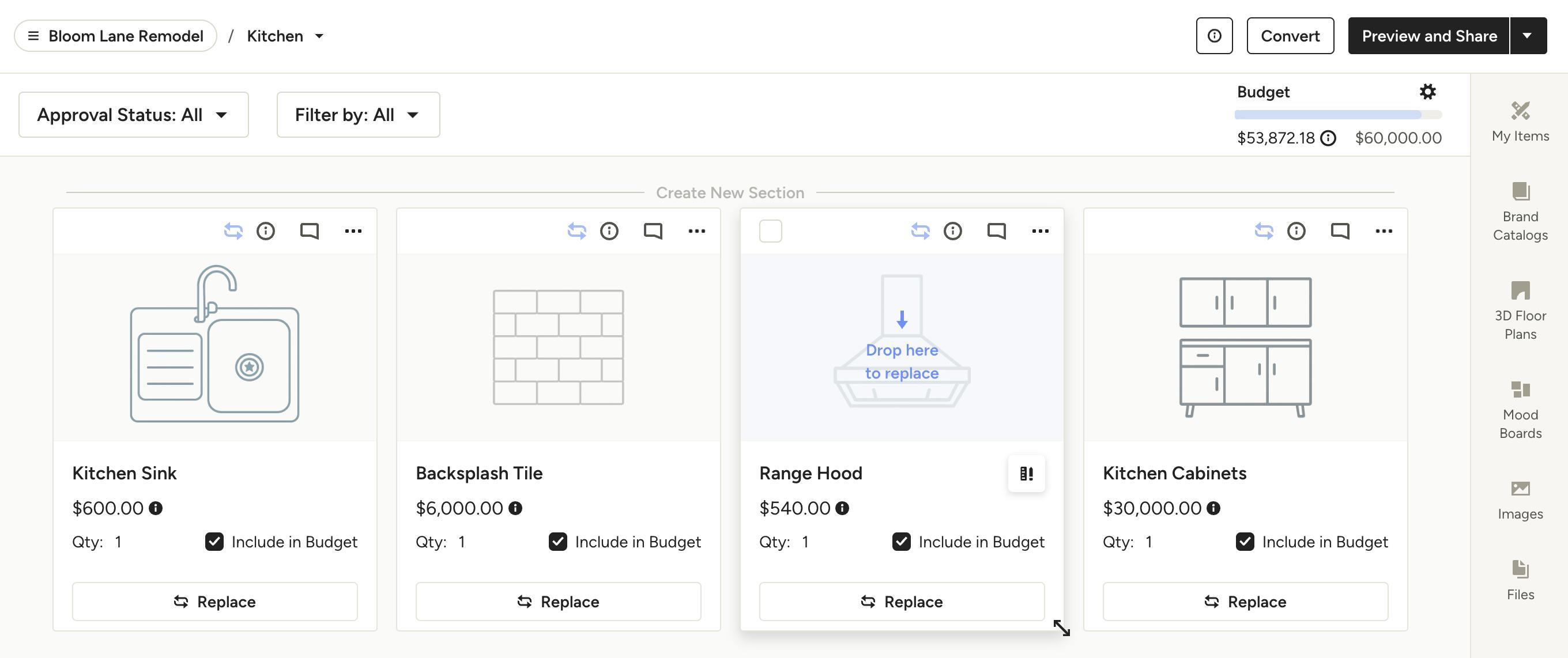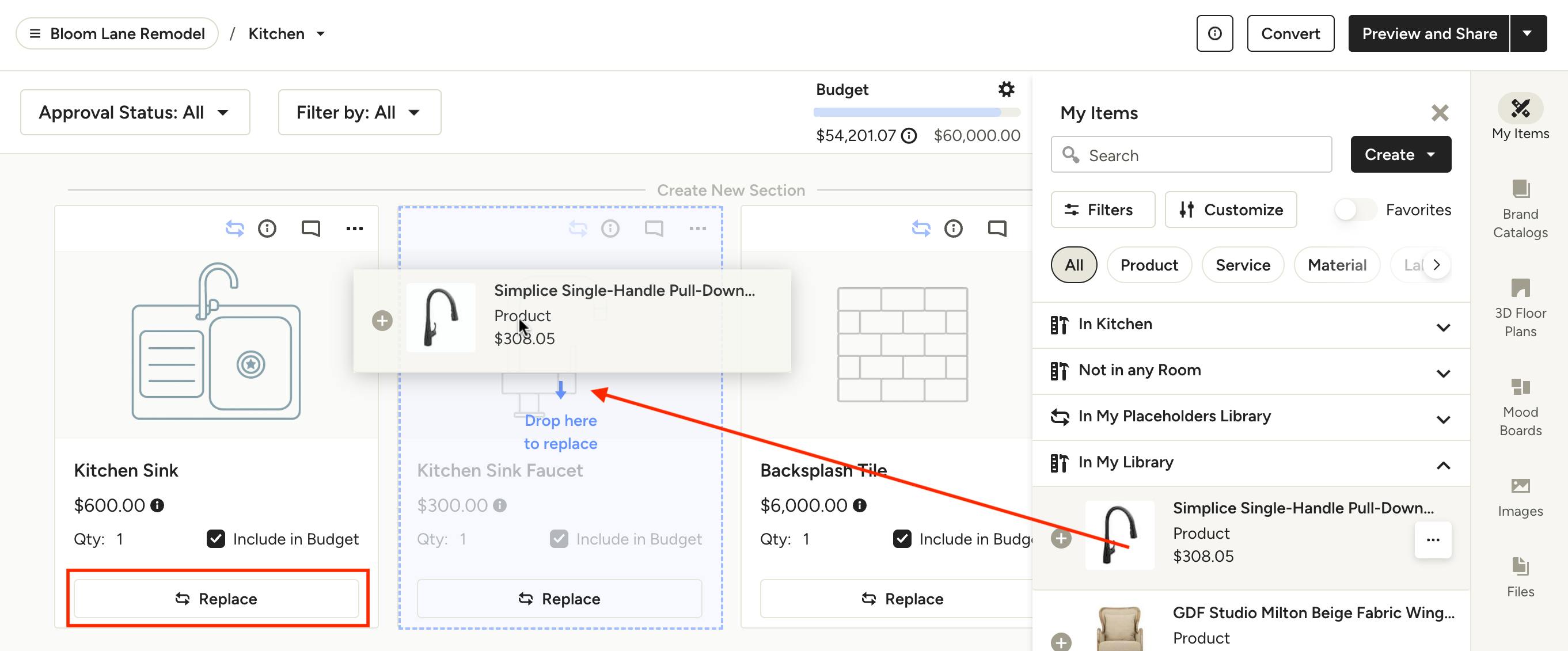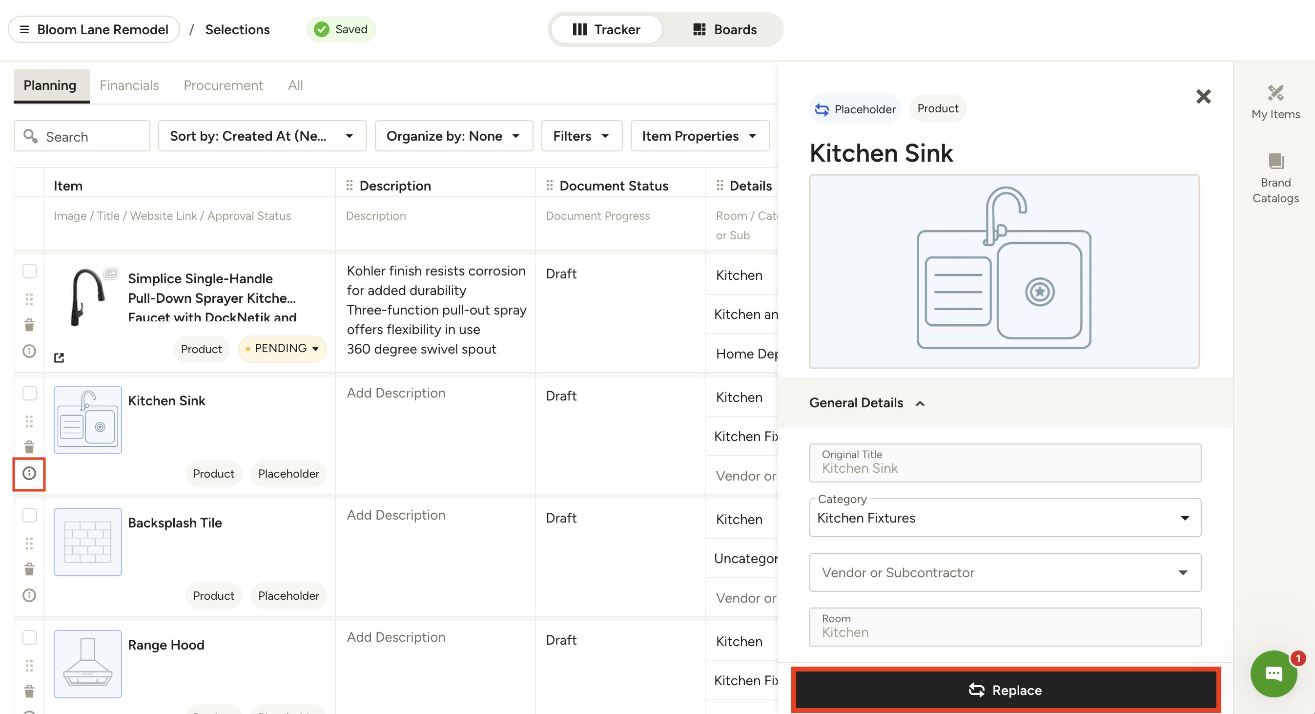 Placeholders can be replaced with real products without losing quantities or budget info. You can replace items on a selections board or tracker, or directly from the Clipper while sourcing items.