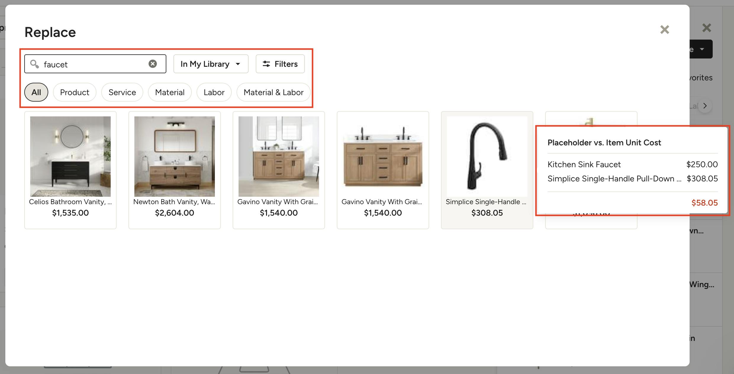 If you click Replace on the placeholder card, or in the Item Overview panel, a Replace modal will appear where you can browse your entire My Items library to select a replacement. Use the search and filters at the top to quickly locate the item you're looking for. Hover over an item to see Placeholder vs. Item Unit Cost comparison. Click an item and confirm to replace the placeholder.