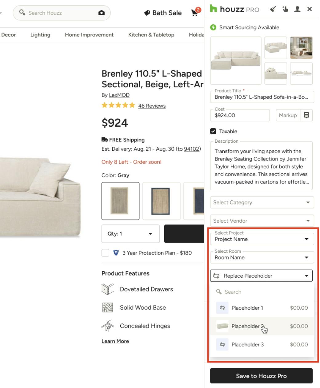To replace a placeholder while clipping products, you first need to select a project and room, as well as check off "Add to Selections Board". If there are available placeholders in the project and room, a Placeholders dropdown will appear. Select the Placeholder you wish to replace and it will be swapped out once you finish clipping the product.